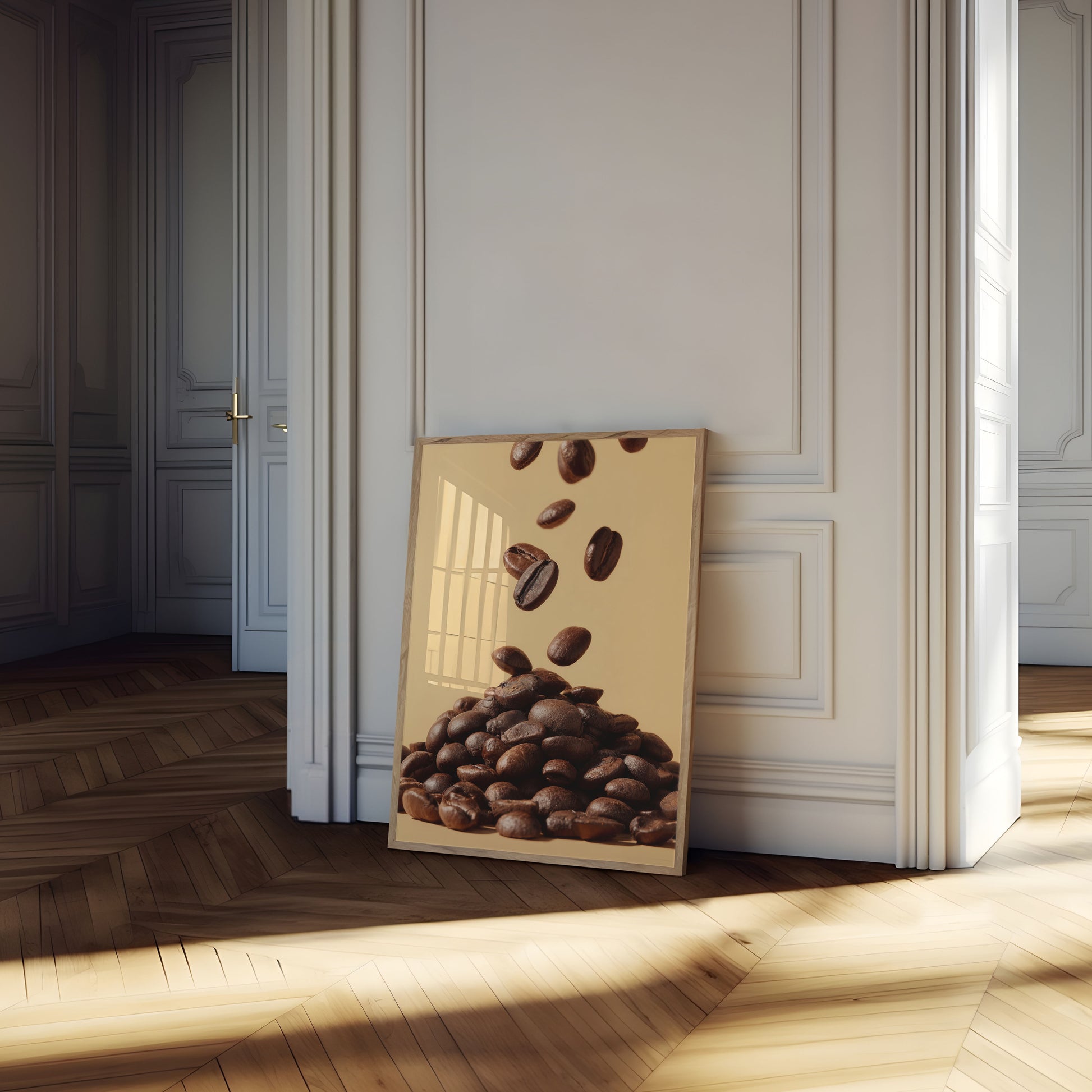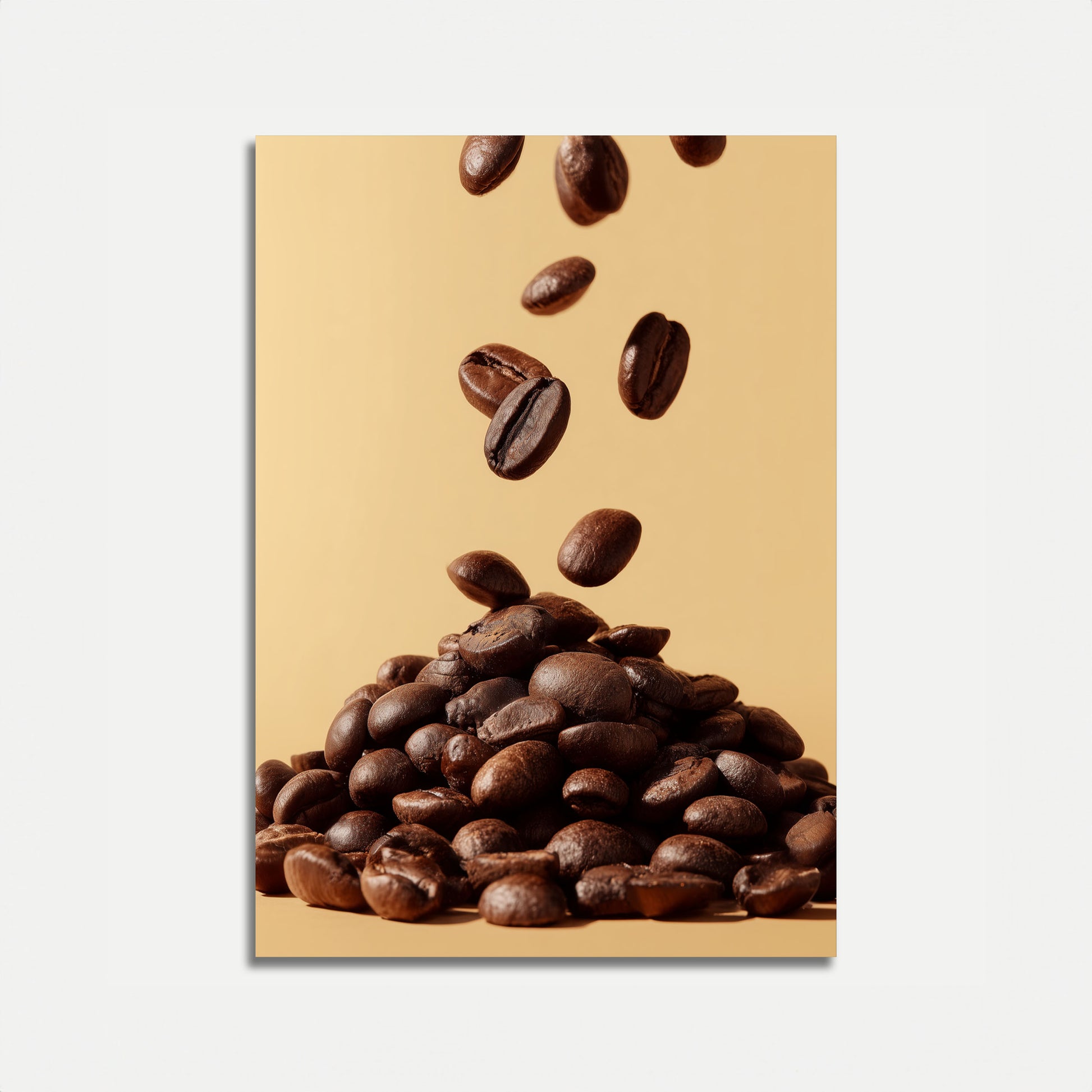 Capture the rich, aromatic essence of coffee with this stunning photographic poster showcasing dark, glossy coffee beans in mid-fall against a warm golden background. Each bean is meticulously detailed, creating a mesmerizing visual cascade that celebrates the beauty of this beloved morning ritual. The image transforms an everyday ingredient into a work of art, inviting coffee lovers and design enthusiasts to appreciate the subtle elegance of these roasted treasures.