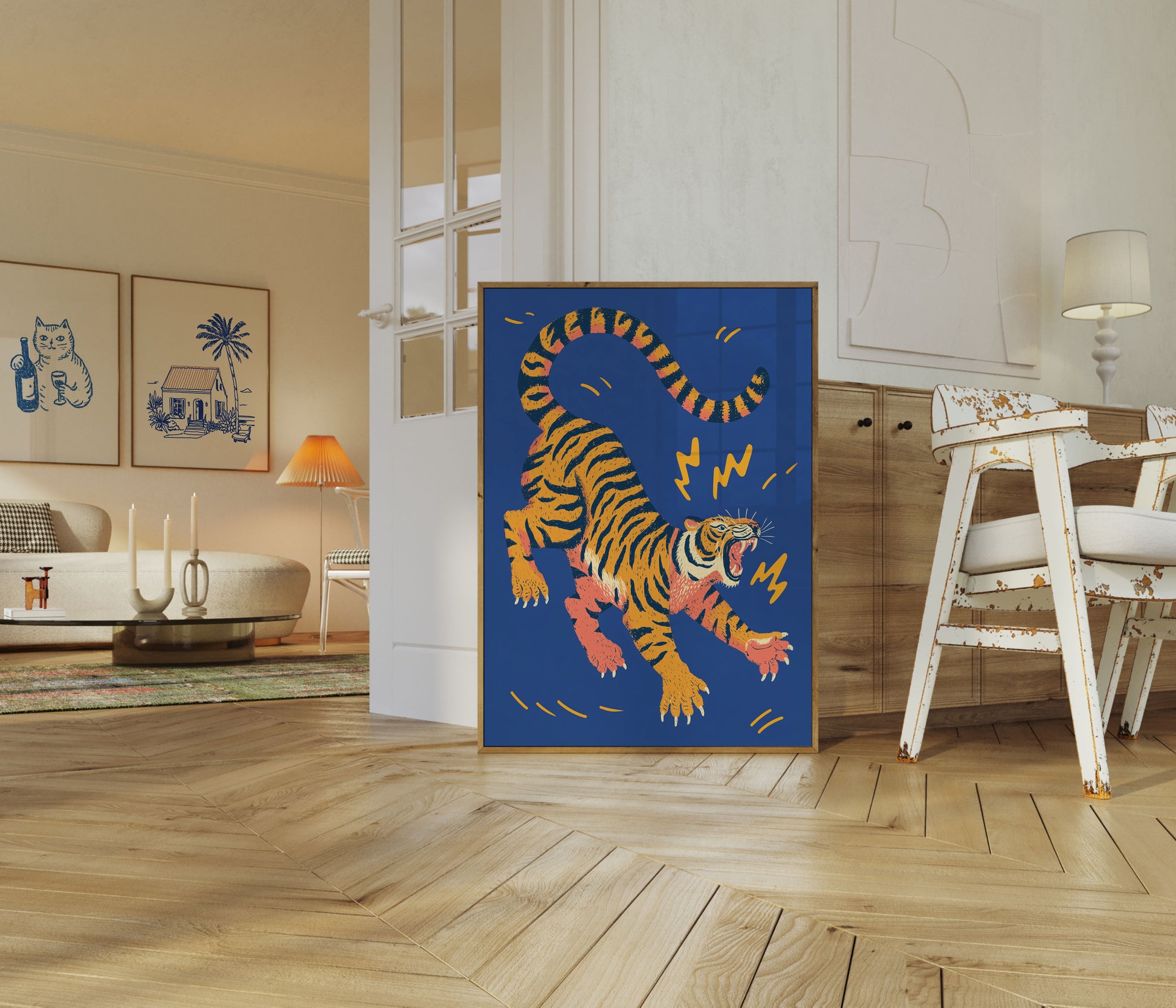 Unleash the wild energy of this electrifying tiger illustration, bursting with vibrant orange, yellow, and navy blue tones. The stylized tiger leaps across the canvas with raw power, its striped body and fierce expression capturing a moment of pure, untamed intensity. Energetic lightning bolt accents and dynamic linework create a sense of movement that will instantly transform any room with bold, graphic character.