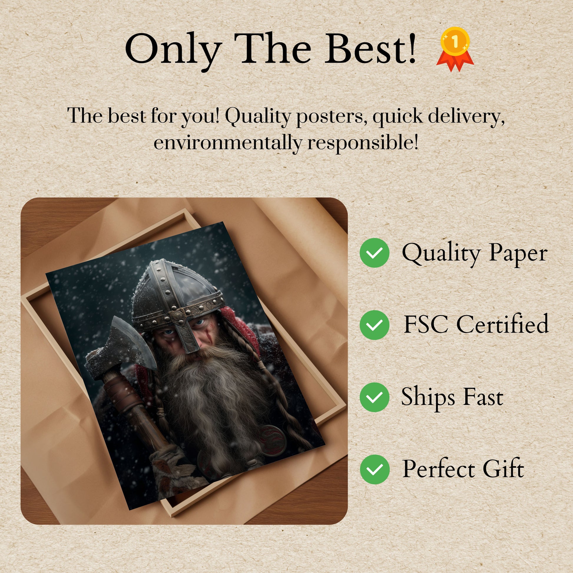 Brace yourself for an epic winter scene featuring a battle-hardened Viking warrior. Captured in stunning detail, this intense portrait showcases a bearded fighter wearing an ornate metal helmet, his piercing blue eyes reflecting determination against a swirling snowstorm. The intricate metalwork, snow-crusted beard, and weathered expression tell a story of strength and survival in the harshest conditions.