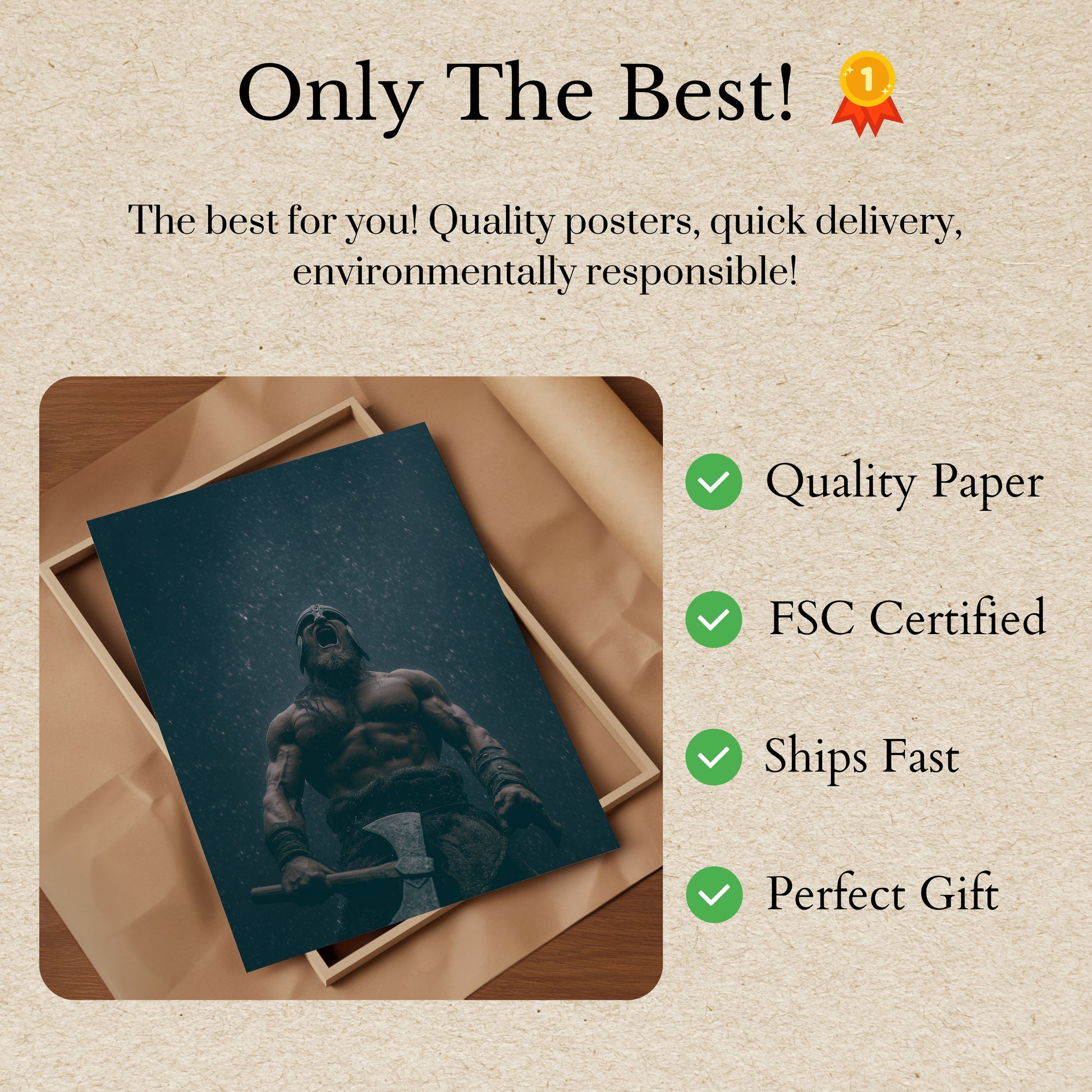 Experience the raw power and primal intensity of this stunning Viking warrior poster. Set against a dark, rain-drenched background, a muscular figure stands resolute, brandishing an axe with fierce determination. The moody atmospheric tones and dramatic lighting capture the spirit of Norse mythology and ancient warrior culture.