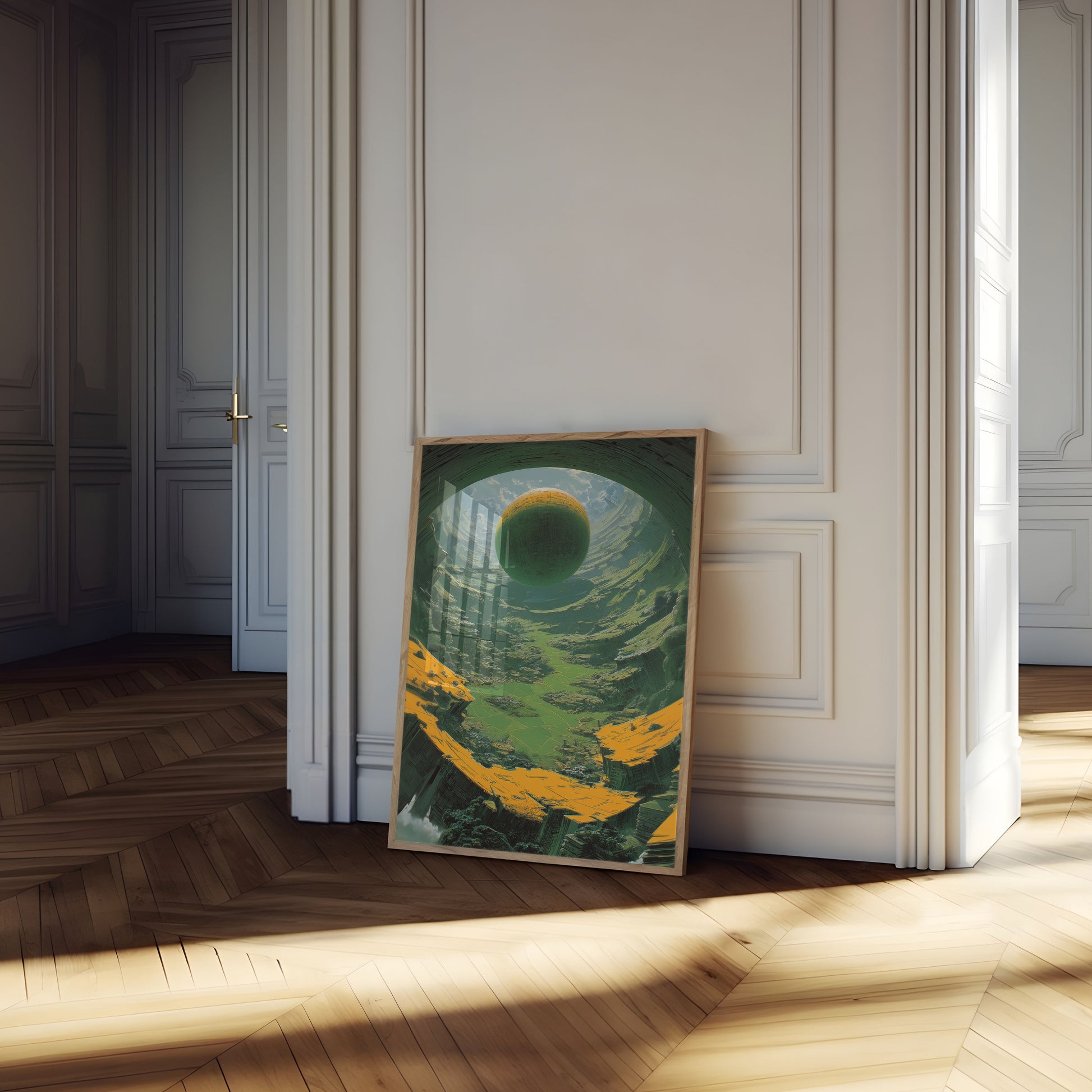 Step into a mesmerizing world where impossible architecture meets natural beauty in this stunning surreal landscape poster. A golden-yellow sphere hovers majestically above a lush green valley, framed by towering ochre and emerald cliffs that seem to defy gravity. The dreamlike composition creates an otherworldly atmosphere with its vibrant color palette—brilliant greens, warm yellows, and cool blue skies—drawing you into a realm where fantasy and reality blur together. This striking artwork captures a sense of wonder and imagination, making it the perfect statement piece for those who appreciate bold, conceptual art.