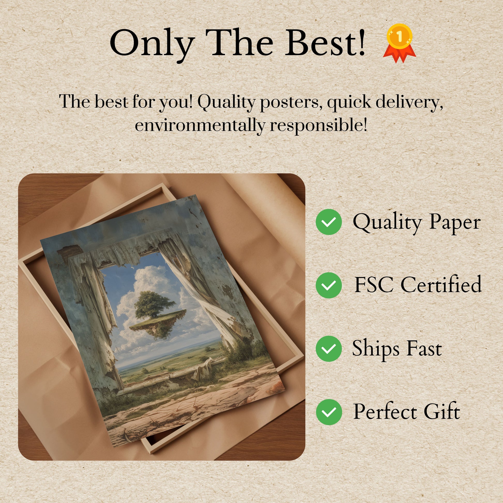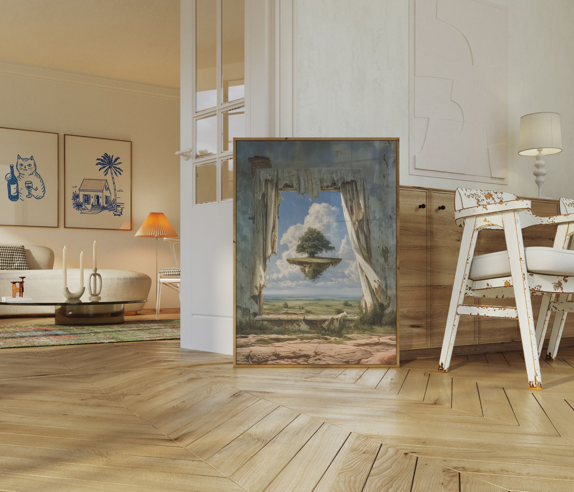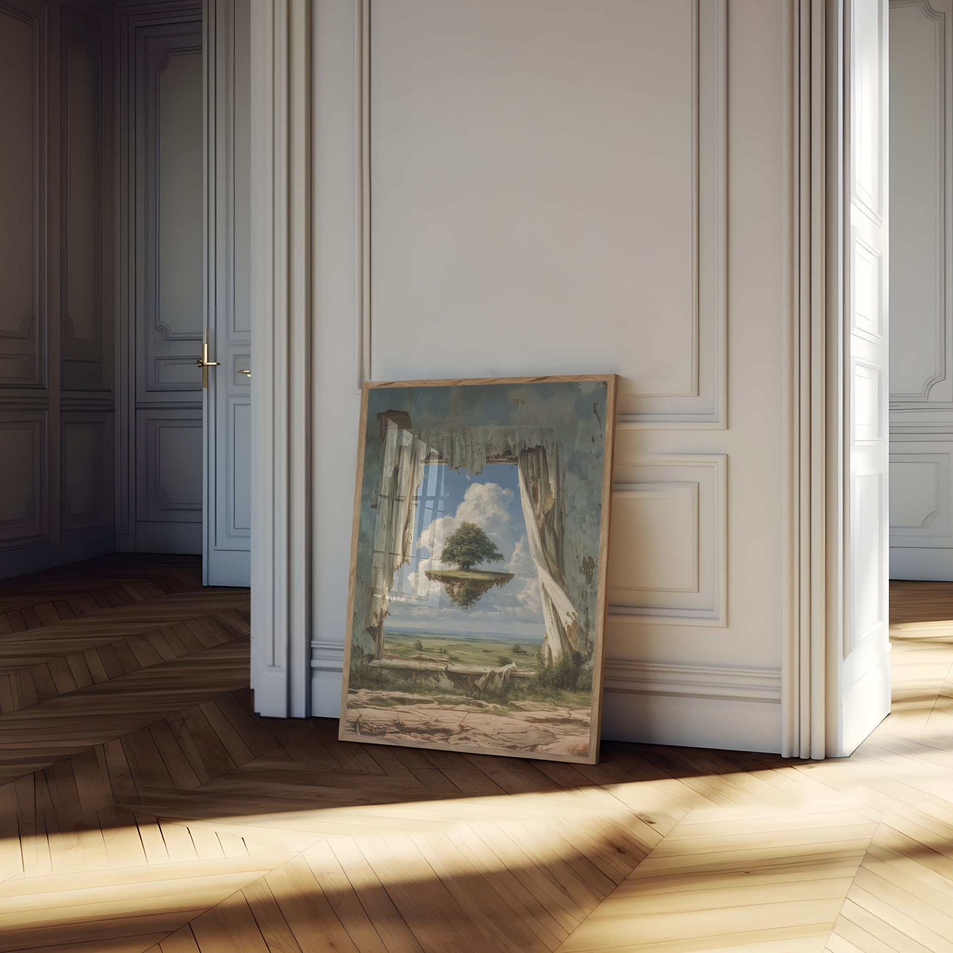 A mesmerizing artwork depicting a lush green tree suspended on a floating island, framed by weathered curtains and revealing an expansive grassy landscape beyond. The image blends reality and imagination, creating a dreamlike portal that transports viewers to a realm where gravity and physics bend to artistic vision. Soft blue skies, billowing clouds, and a meticulously detailed tree invite contemplation and wonder.