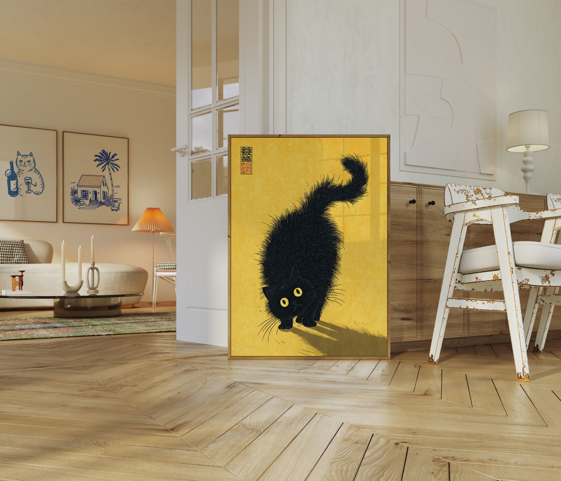 Discover a stunning artistic rendition of a mesmerizing black cat against a warm golden background. This striking illustration captures the essence of feline mystique with its incredibly detailed, spiky fur and luminous yellow eyes. The dramatic contrast between the jet-black cat and the sunbright backdrop creates an enchanting visual experience that will transform any room.