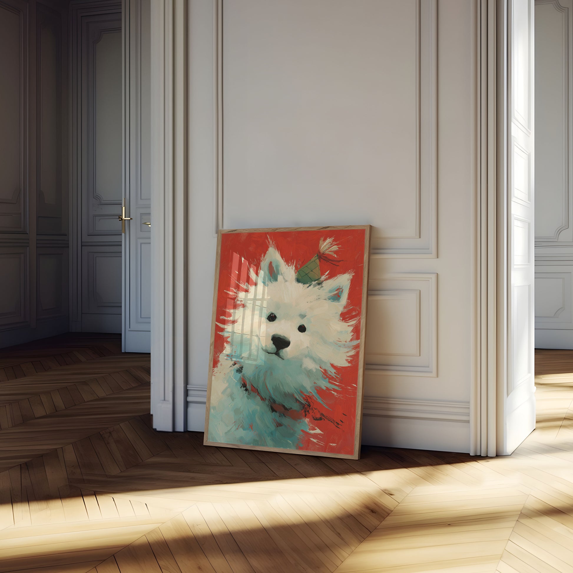 Immerse yourself in this striking artistic rendering of a pure white Samoyed dog, captured with dynamic brushstrokes against a vibrant red background. The painting brings incredible energy and personality to this adorable canine, with soft white fur bursting outwards and deep, soulful eyes that seem to connect directly with the viewer. Splashes of teal and crimson create a dramatic, modern art feel that will enliven any space.