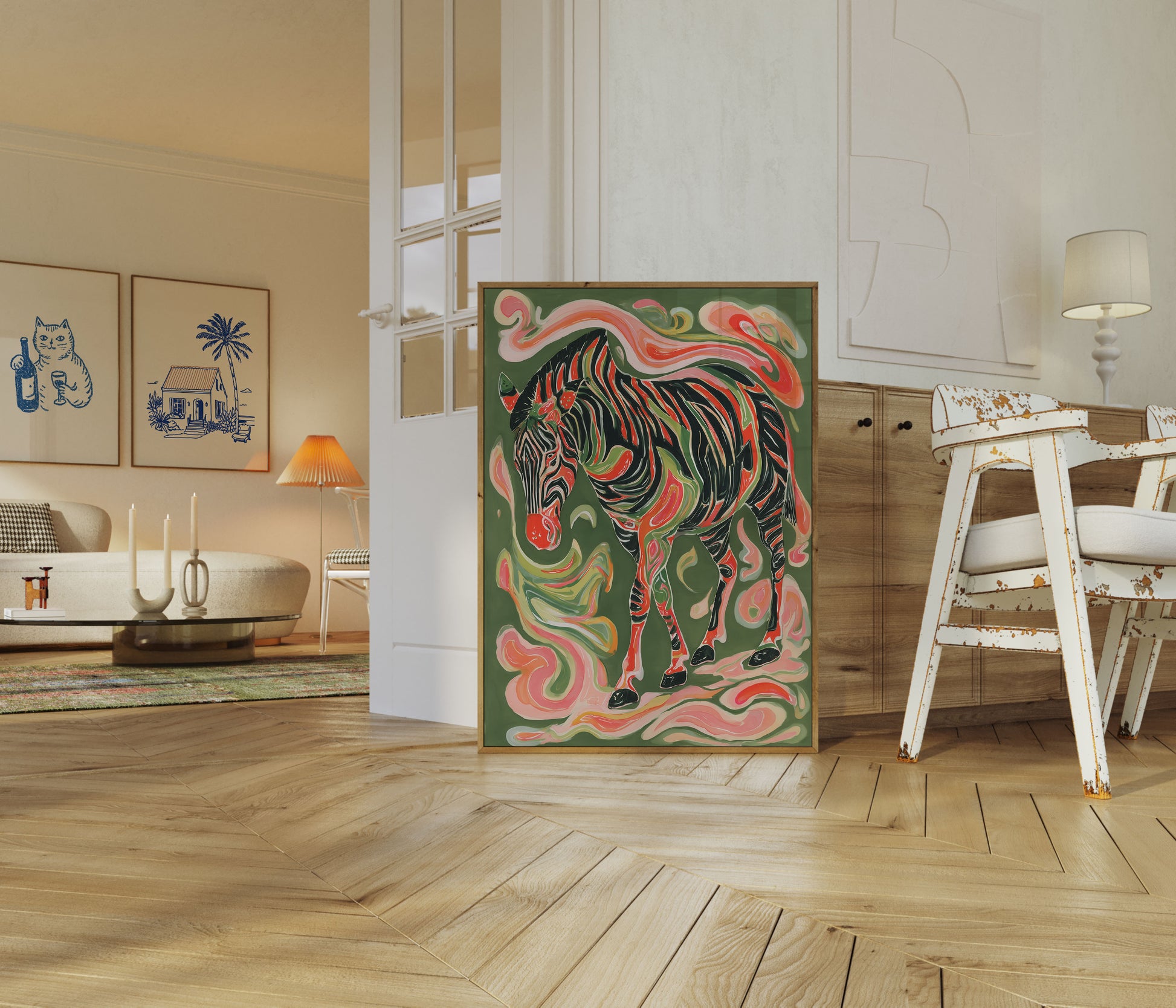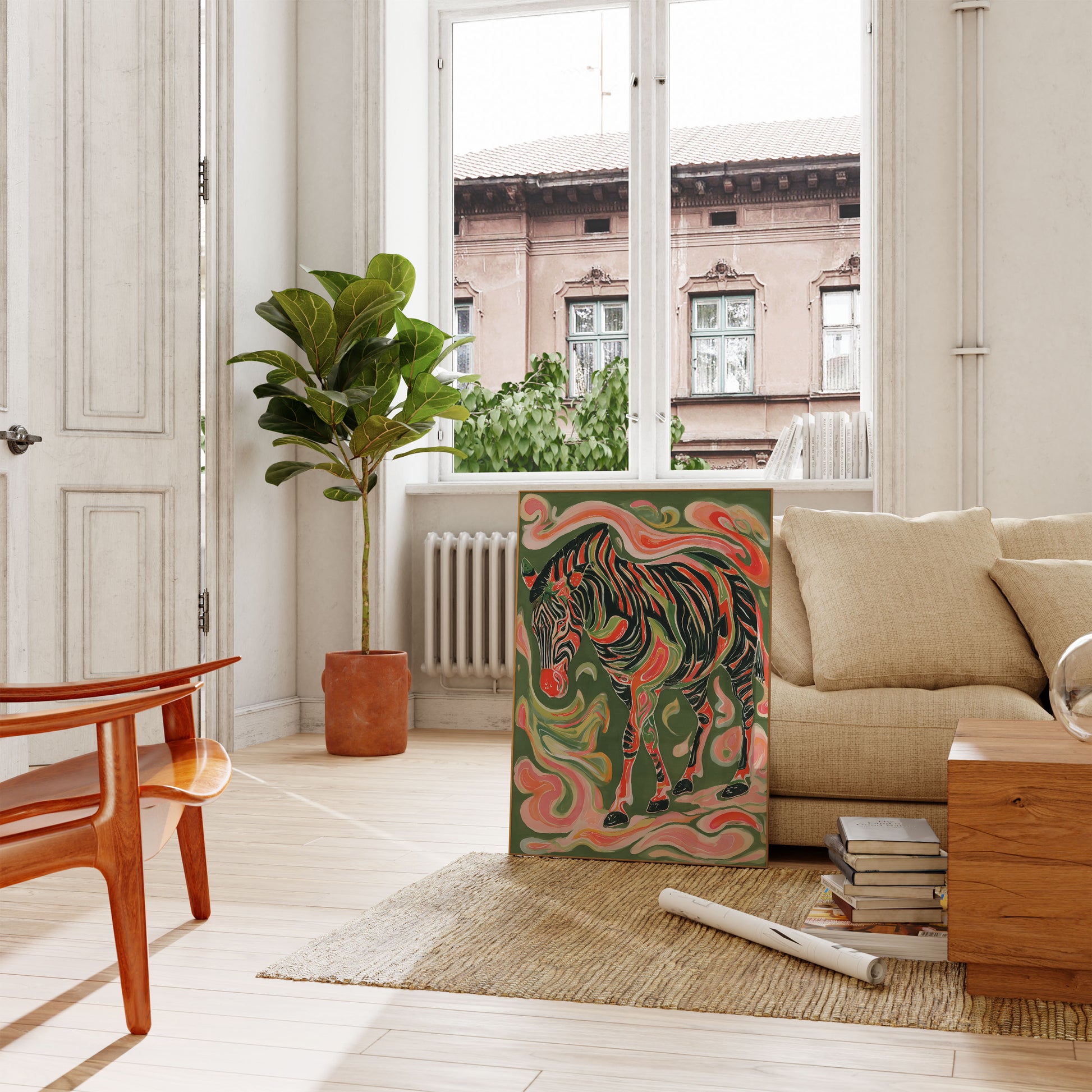 A mesmerizing artistic interpretation of a zebra, rendered in swirling streams of vibrant coral, deep green, and rich black. The animal appears to be moving and flowing, its stripes melting and blending into dynamic, curving shapes that create a sense of rhythmic motion against a sage green background. Each brushstroke seems alive, transforming the traditional zebra form into a fluid, almost dreamlike representation.