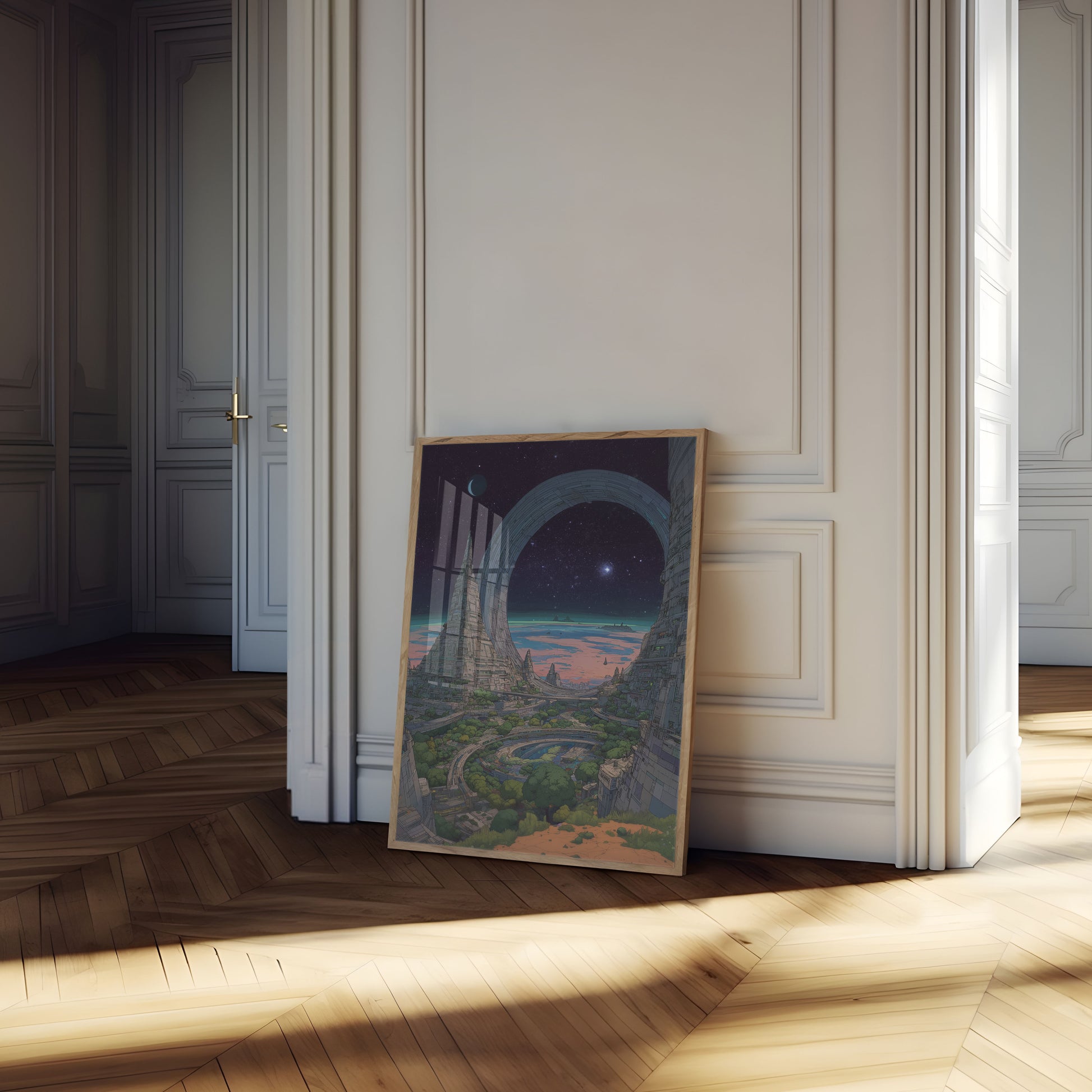 Step into a mesmerizing sci-fi landscape where advanced architecture blends seamlessly with lush green spaces. Massive curved structures and towering spires frame a breathtaking view of a distant planet, with a crescent moon and starry sky creating an otherworldly atmosphere. The intricate cityscape combines geometric precision with organic elements, inviting viewers to explore a vision of future urban design.