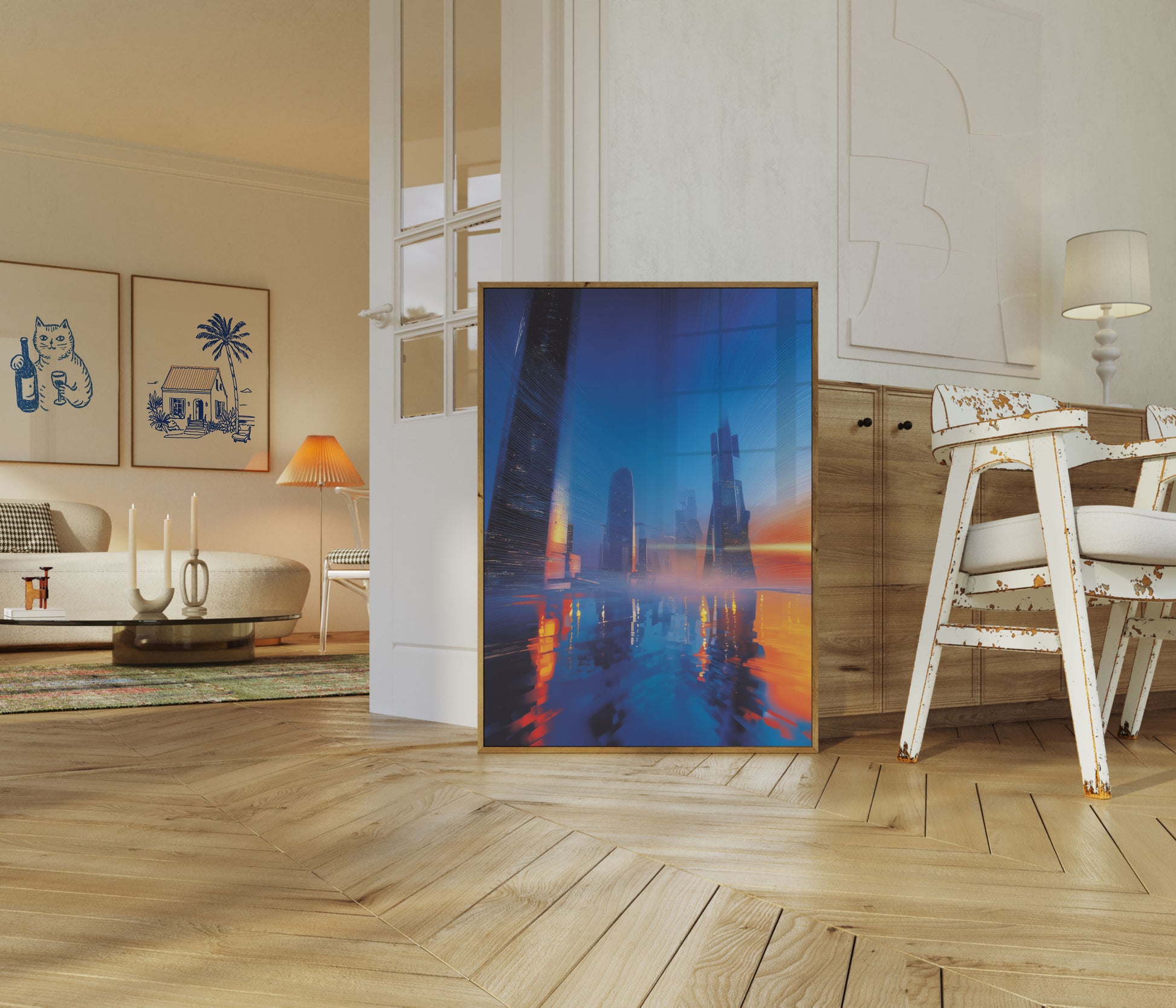 Experience a mesmerizing urban landscape where sleek skyscrapers pierce a dreamy blue and orange gradient sky. Towering architectural marvels reflect in a glassy, misty foreground, creating an ethereal vision of a future metropolis bathed in luminous light and dynamic energy. The image blends architectural precision with a surreal, almost liquid-like atmosphere that blurs the lines between reality and imagination.