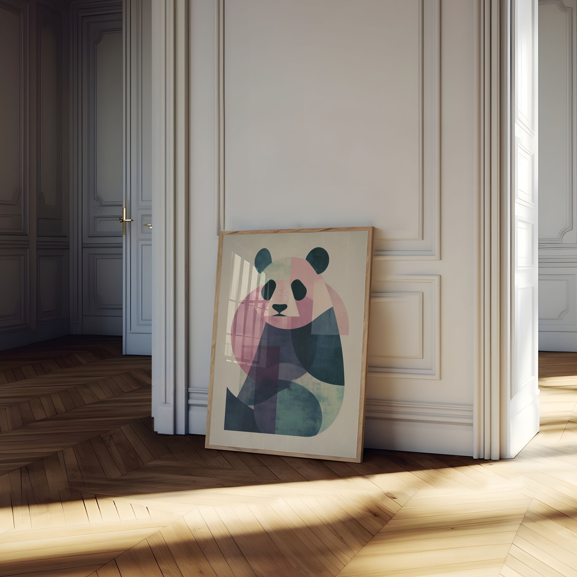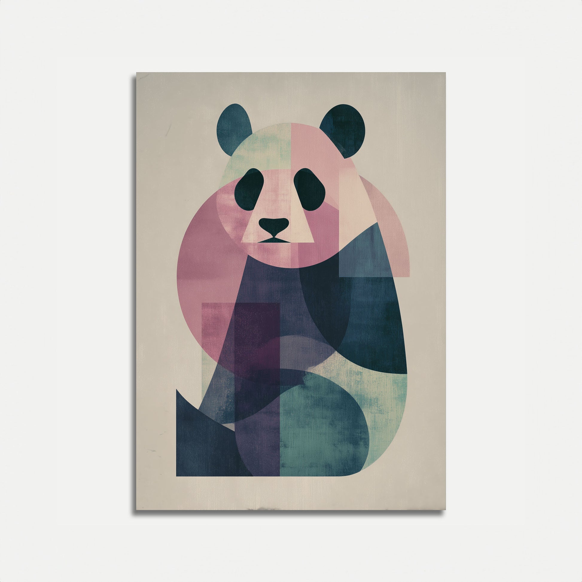 A mesmerizing geometric interpretation of a panda, crafted with soft pastel hues and bold angular shapes. This modern art poster transforms the beloved bear into a stunning visual composition of overlapping pink, blue, and green tones. The minimalist design captures the essence of the panda with elegant simplicity and contemporary flair.