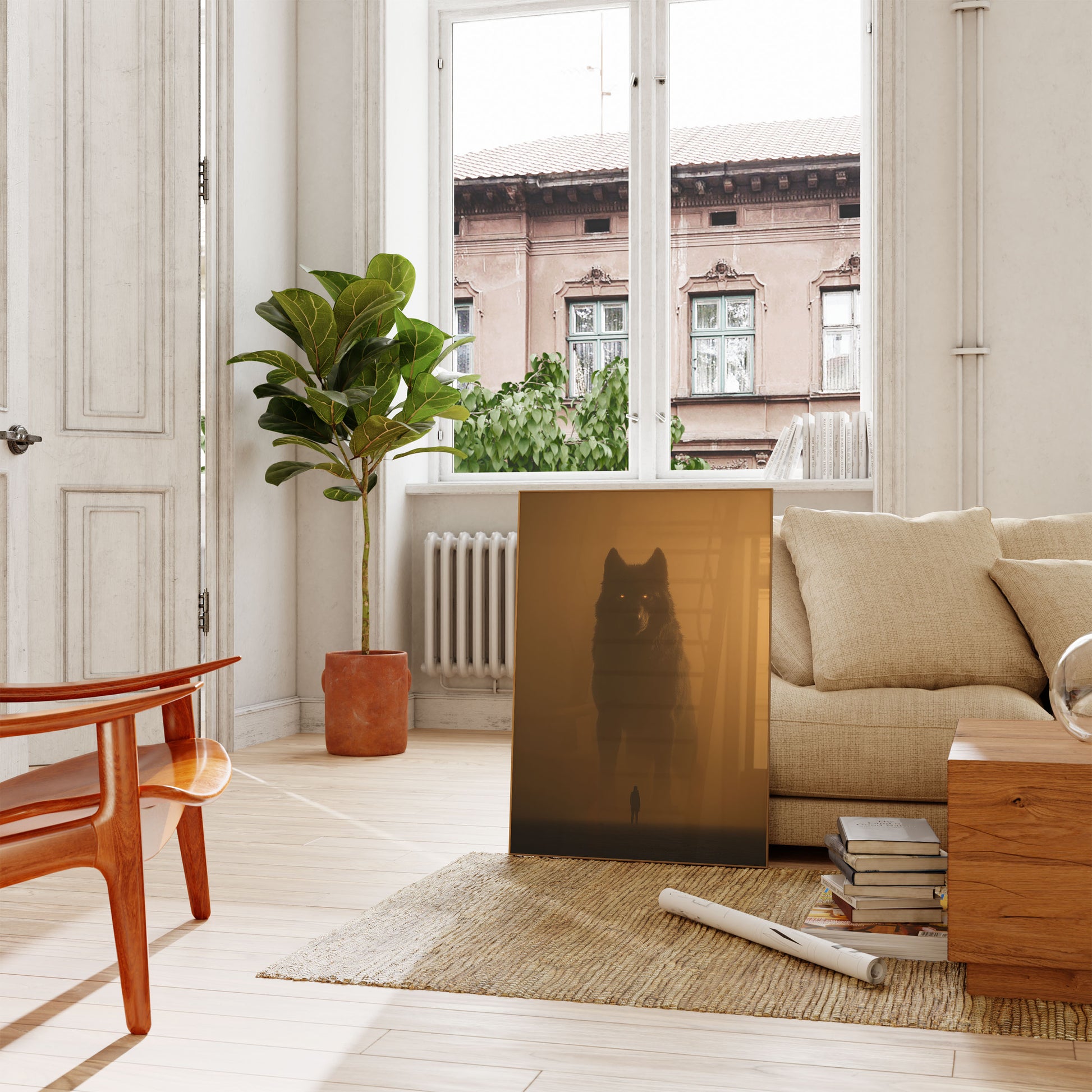 A mesmerizing and surreal image depicting an enormous wolf looming over a solitary figure in a golden, misty landscape. The wolf's glowing eyes pierce through the hazy atmosphere, creating an ethereal and mystical scene that blends dream-like fantasy with raw, primordial power. This striking poster captures the profound sense of scale between the majestic creature and the tiny human silhouette.