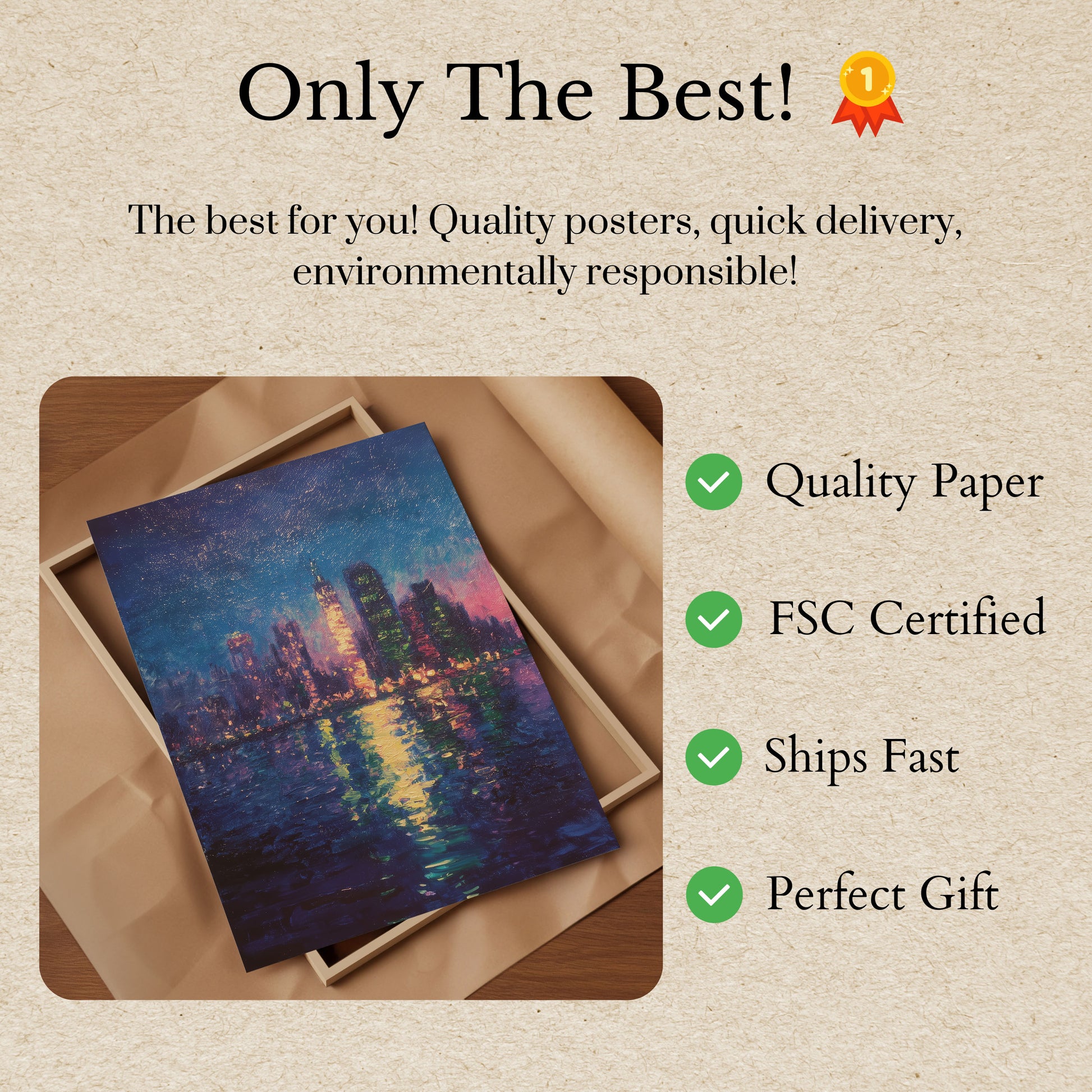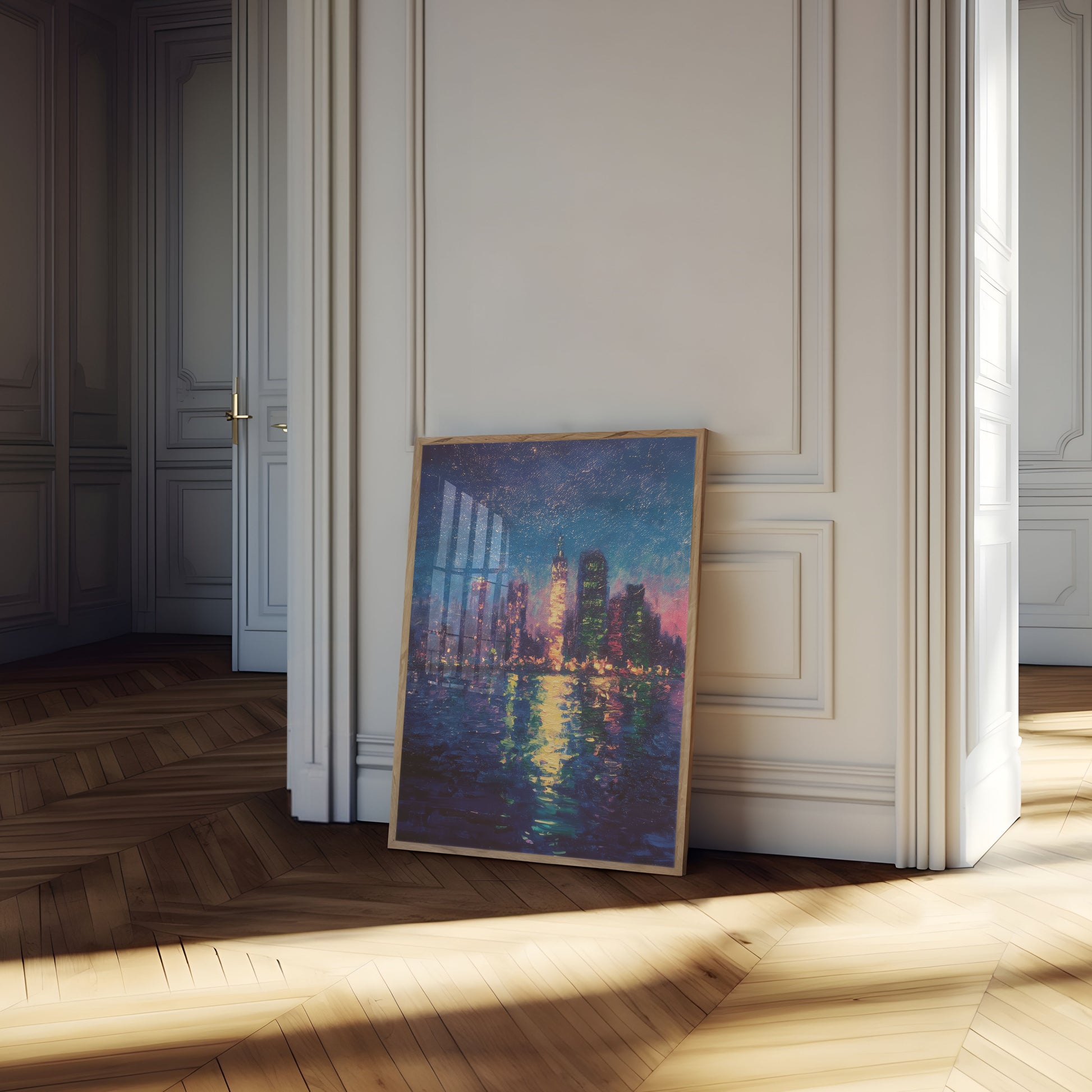 A mesmerizing cityscape that captures the magical essence of an urban night. Vibrant blues, yellows, and greens blend together, creating a dreamlike reflection of skyscrapers in shimmering water. The artwork transforms the city into a luminous wonderland, with twinkling lights and starry textures that bring the metropolitan landscape to life.