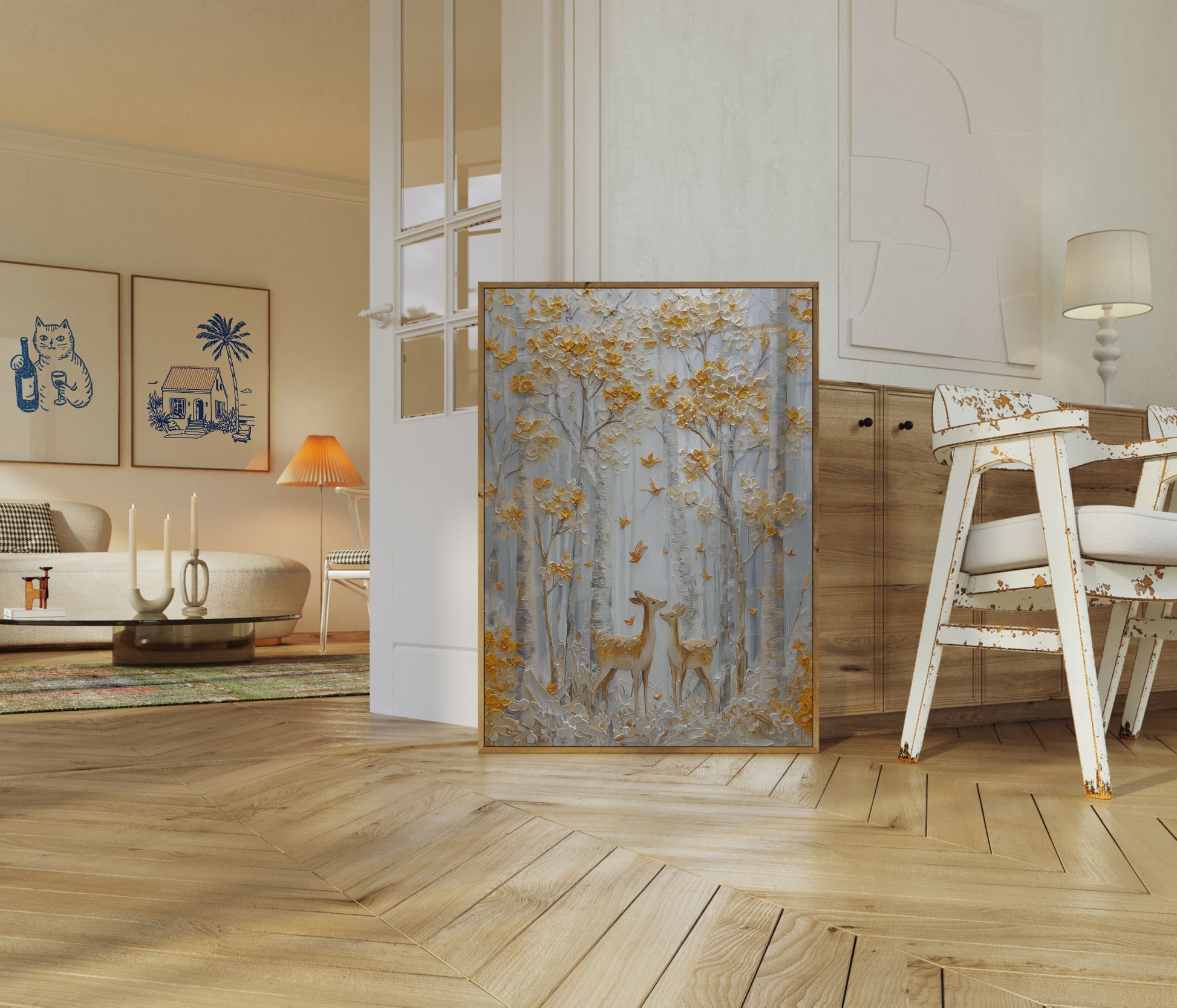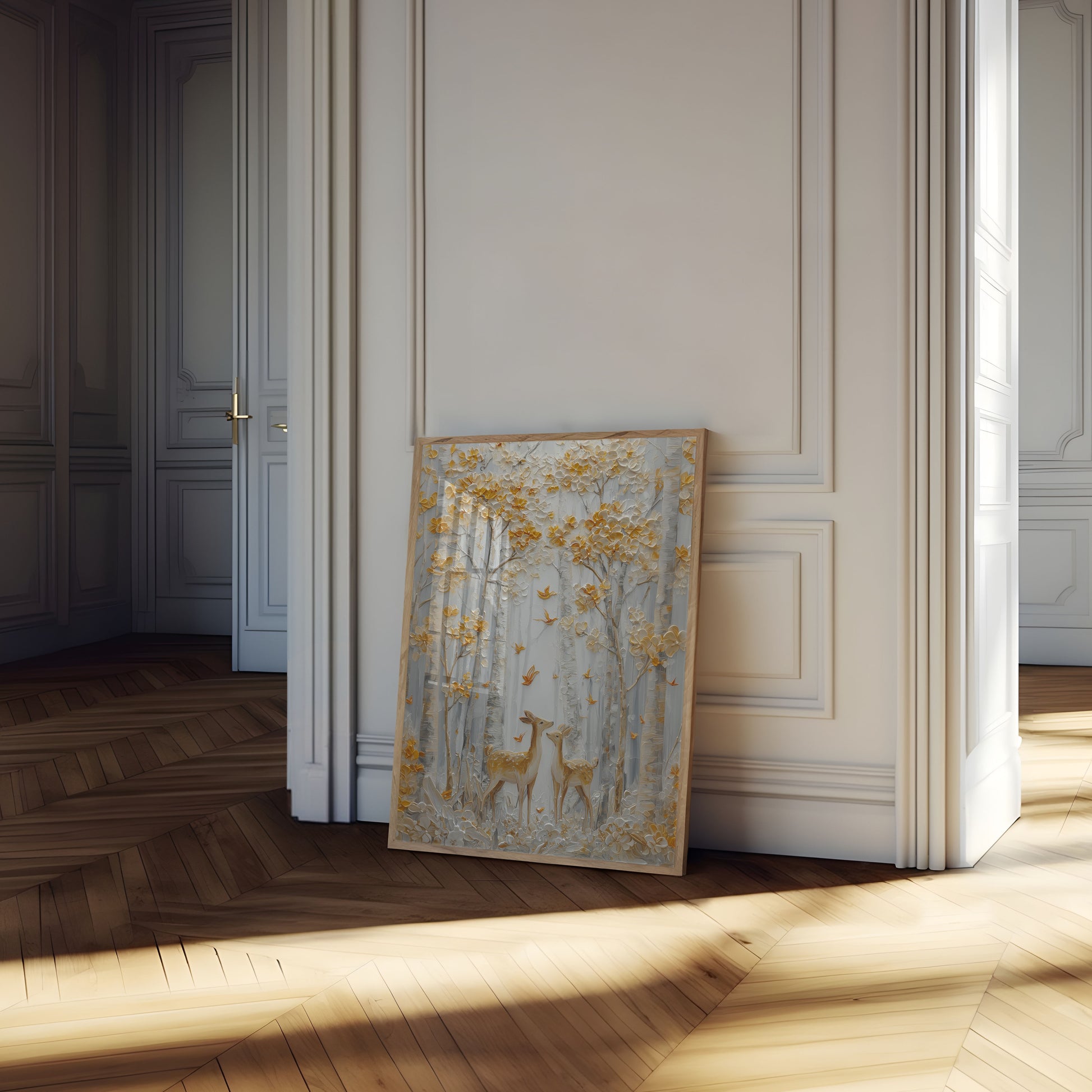 Step into an enchanting woodland scene where delicate golden-hued trees frame two gentle deer standing amidst a serene landscape. Soft white and amber tones create a dreamy, textured environment where small golden birds flutter between branches, capturing a moment of pure tranquility and natural beauty. The intricate palette and layered painting technique bring depth and movement to this stunning forest sanctuary.
