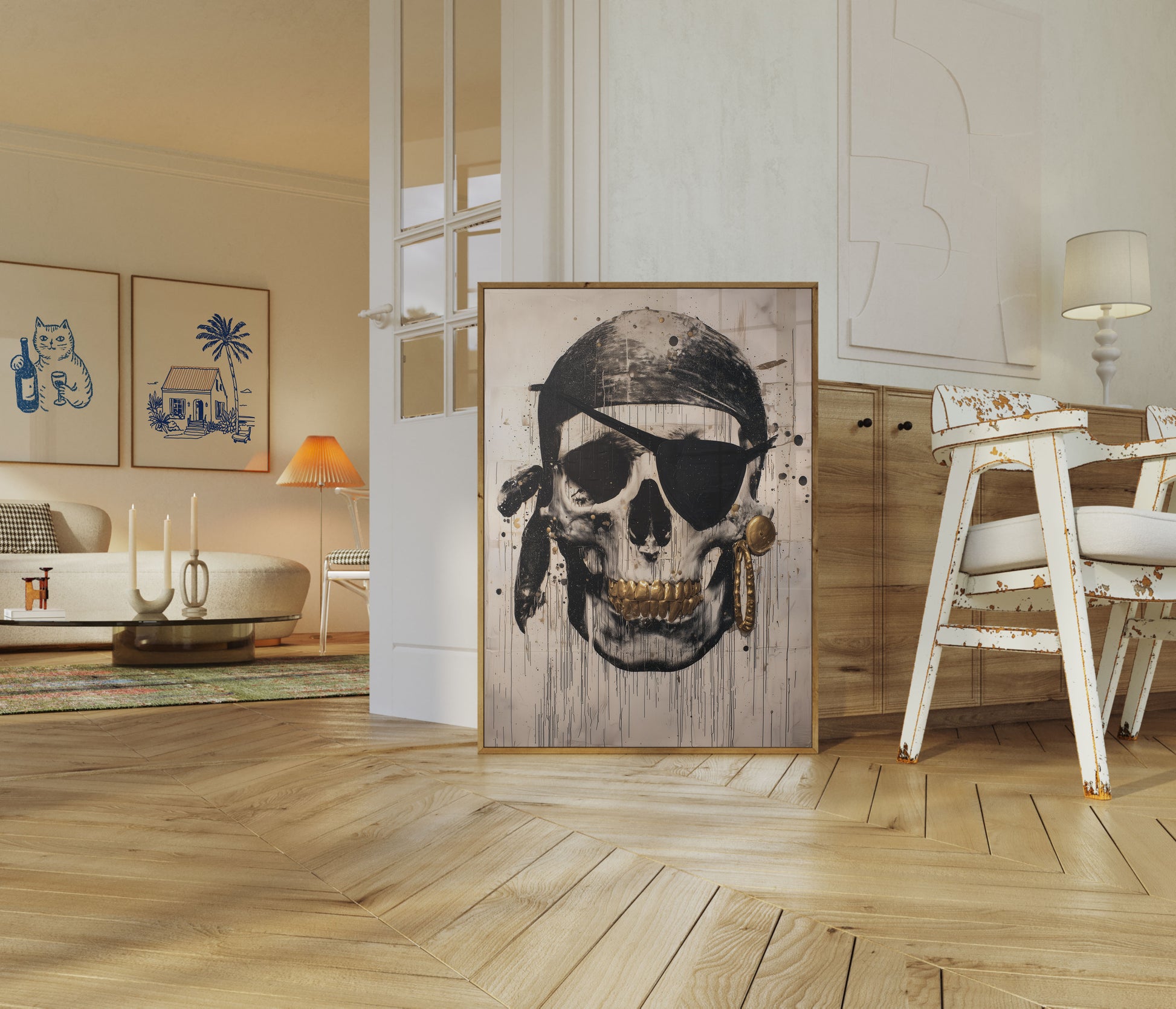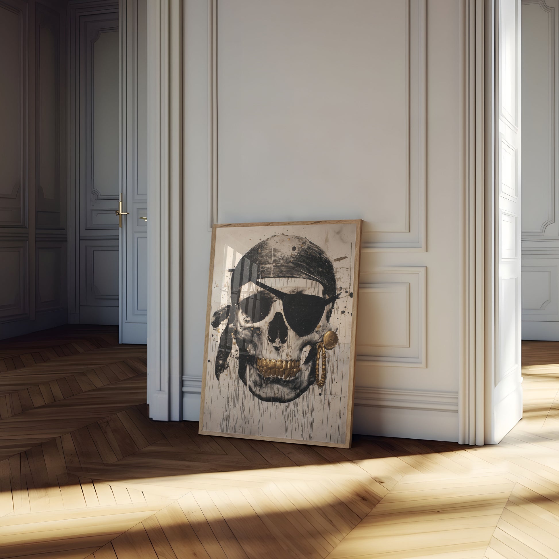 A striking, avant-garde art piece featuring a stylized skull adorned with a black bandana and sunglasses, highlighted by gleaming gold teeth and accents. This edgy artwork blends urban street art with pirate mythology, creating a bold statement piece with dramatic black and gold contrasts against a weathered background.