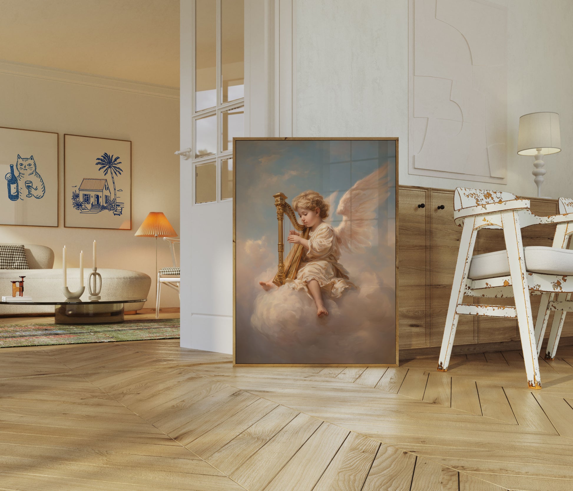 A delicate angelic figure sits serenely on soft clouds, playing an ornate golden harp with pure concentration. Soft pastel clouds and a dreamy blue sky create a celestial backdrop for this ethereal scene, capturing a moment of divine musical inspiration. The detailed artwork radiates peace and spiritual tranquility.