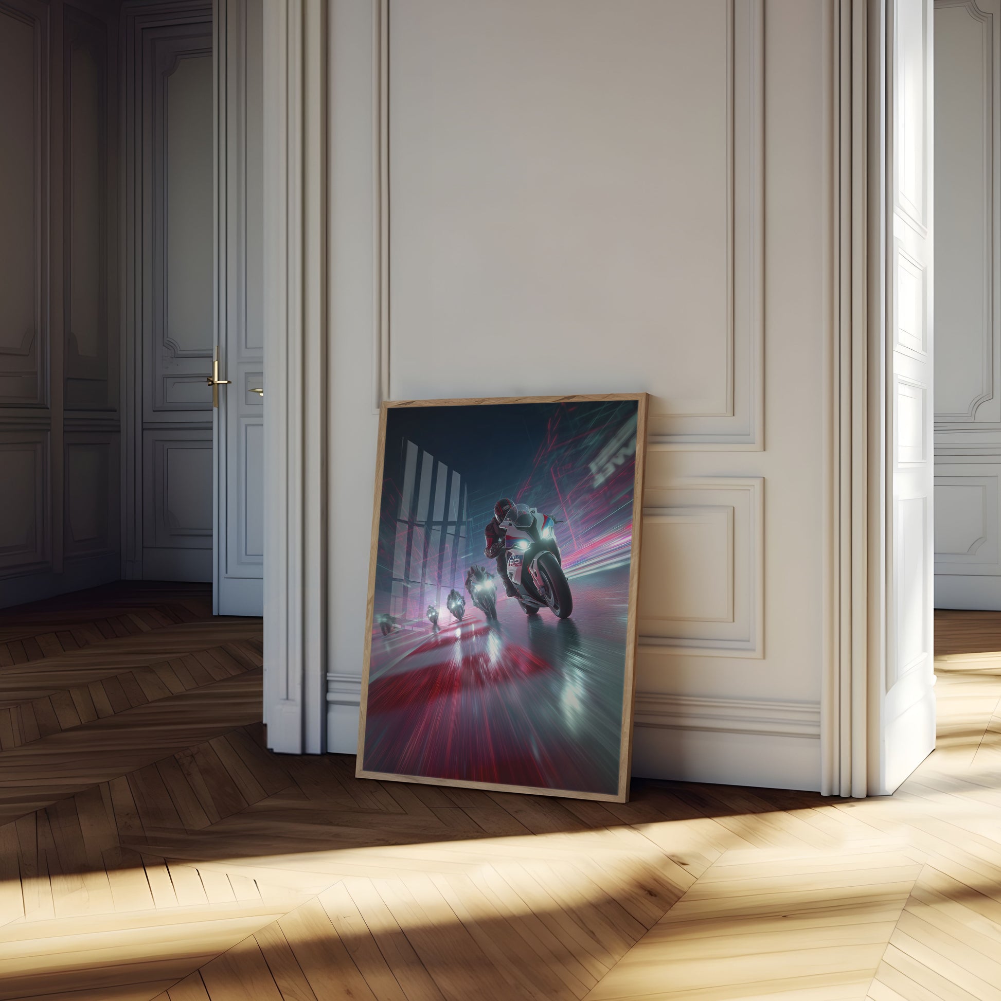 Experience the electrifying intensity of motorcycle racing with this dynamic digital artwork. Sleek sport bikes slice through a blur of red and blue, capturing the raw velocity and technological precision of professional motorsports. The luminous headlights and motion-streaked background create a pulse-pounding visual that embodies speed and cutting-edge performance.