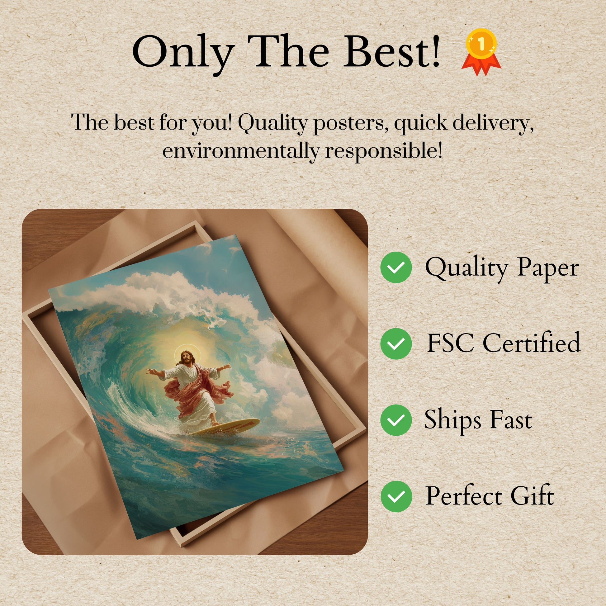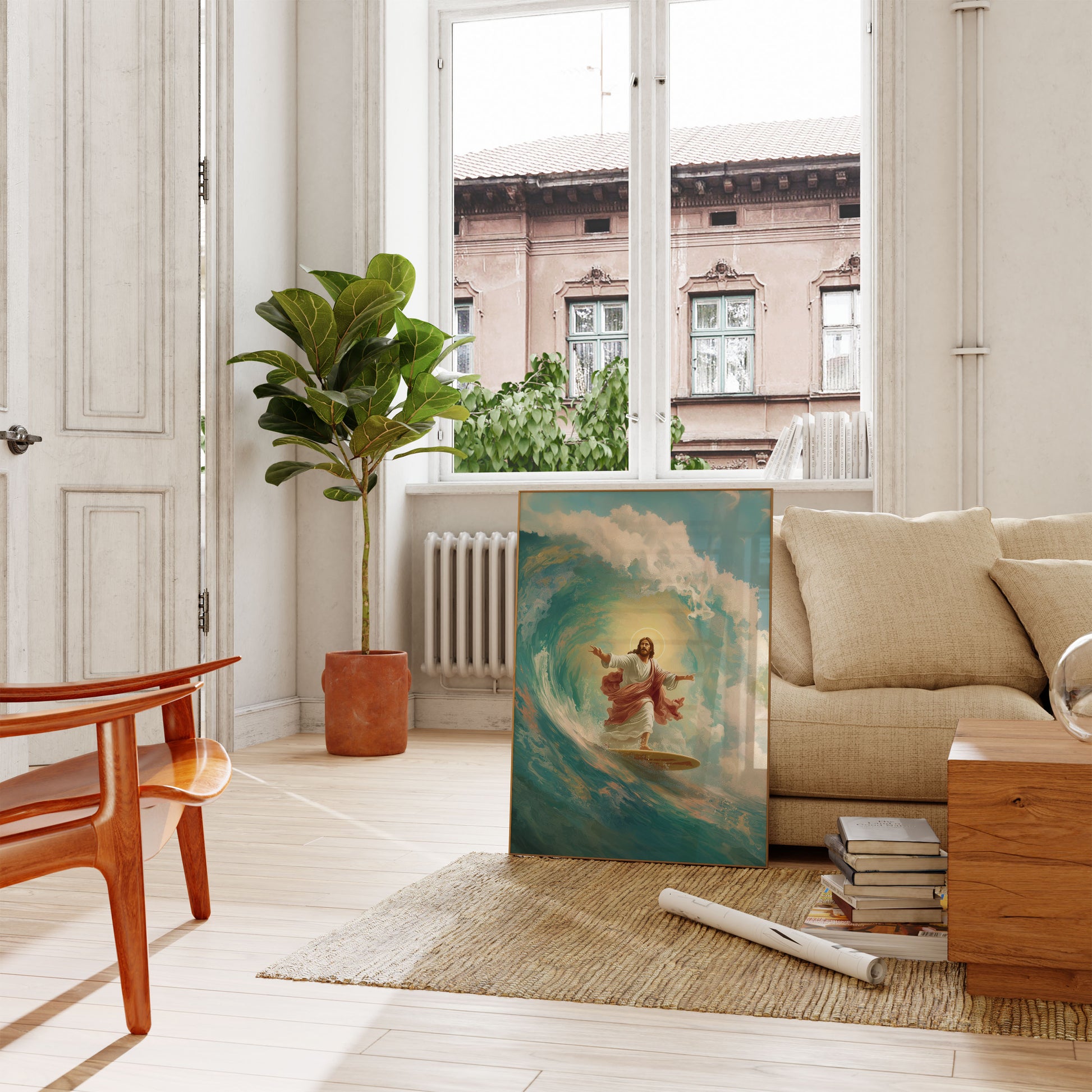 Catch the divine wave of creativity with this mind-blowing illustration featuring a spiritual surfing sensation! This stunning artwork depicts a radiant figure riding an epic ocean curl, combining sacred imagery with radical surf culture in a way that's both reverent and wildly entertaining. Vibrant turquoise waves swirl around a luminous, surf-mastering presence, creating a visual masterpiece that will spark conversation and bring a smile to anyone's face.