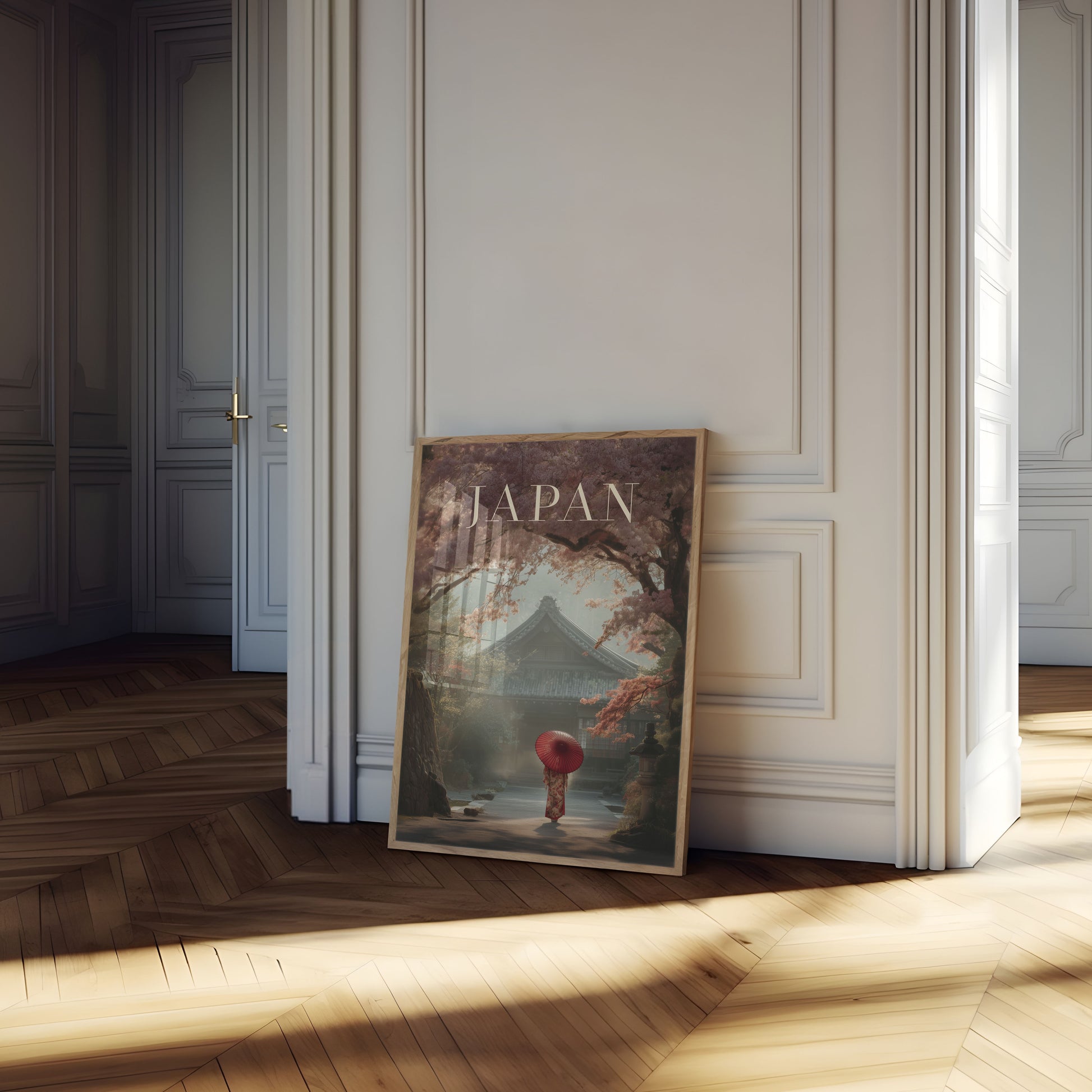 Step into a serene moment frozen in time with this stunning Japanese-inspired artwork. A solitary figure in a crimson kimono and matching umbrella stands beneath a canopy of delicate pink cherry blossoms, gazing toward a traditional temple shrouded in misty tranquility. The composition perfectly captures the peaceful beauty of Japan's most iconic season, with warm earthy tones and soft light creating an atmosphere of contemplation and timeless elegance that invites you to pause and breathe in the moment.