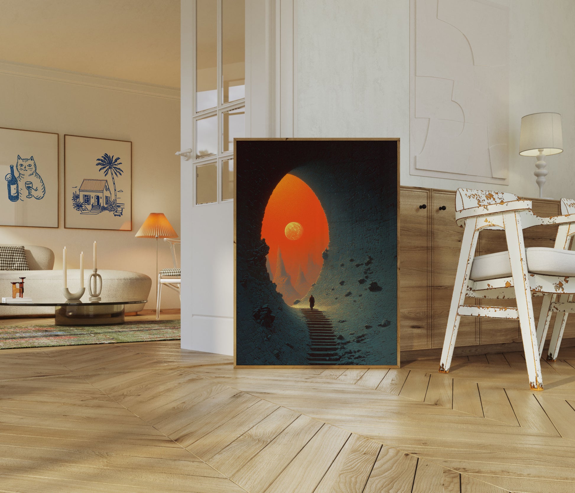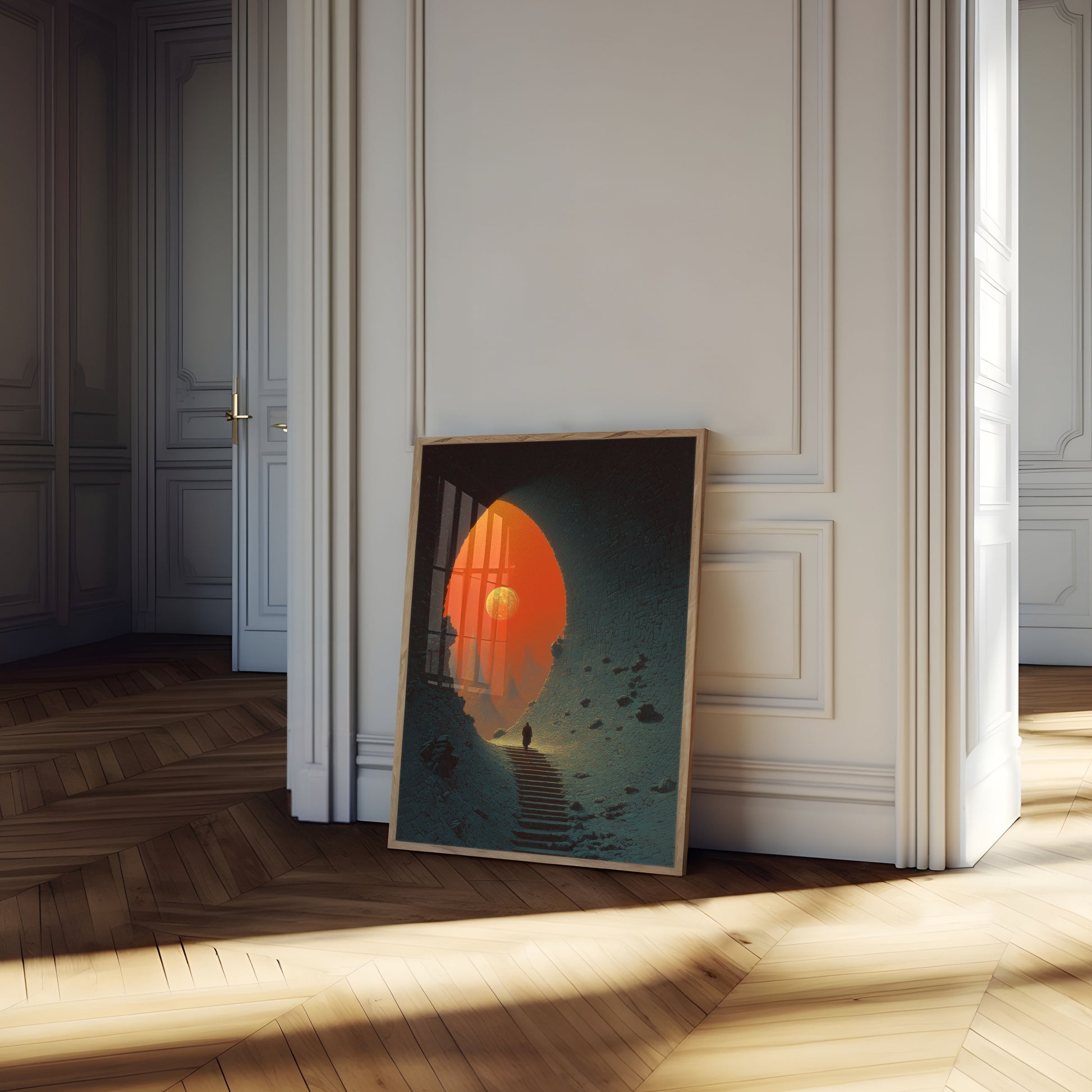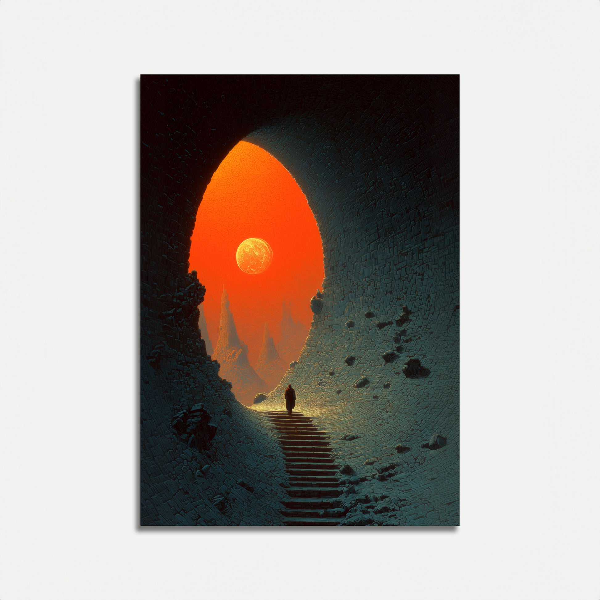 Step into a realm of mystery and wonder with this breathtaking fantasy landscape. A solitary figure ascends worn stone steps toward a colossal archway, framed against a glowing amber sky dominated by a luminous golden sun. The dramatic contrast between the dark, textured stone walls and the warm, radiant glow creates an atmosphere of discovery and adventure, evoking the feeling of uncovering lost civilizations and embarking on an epic quest through time.