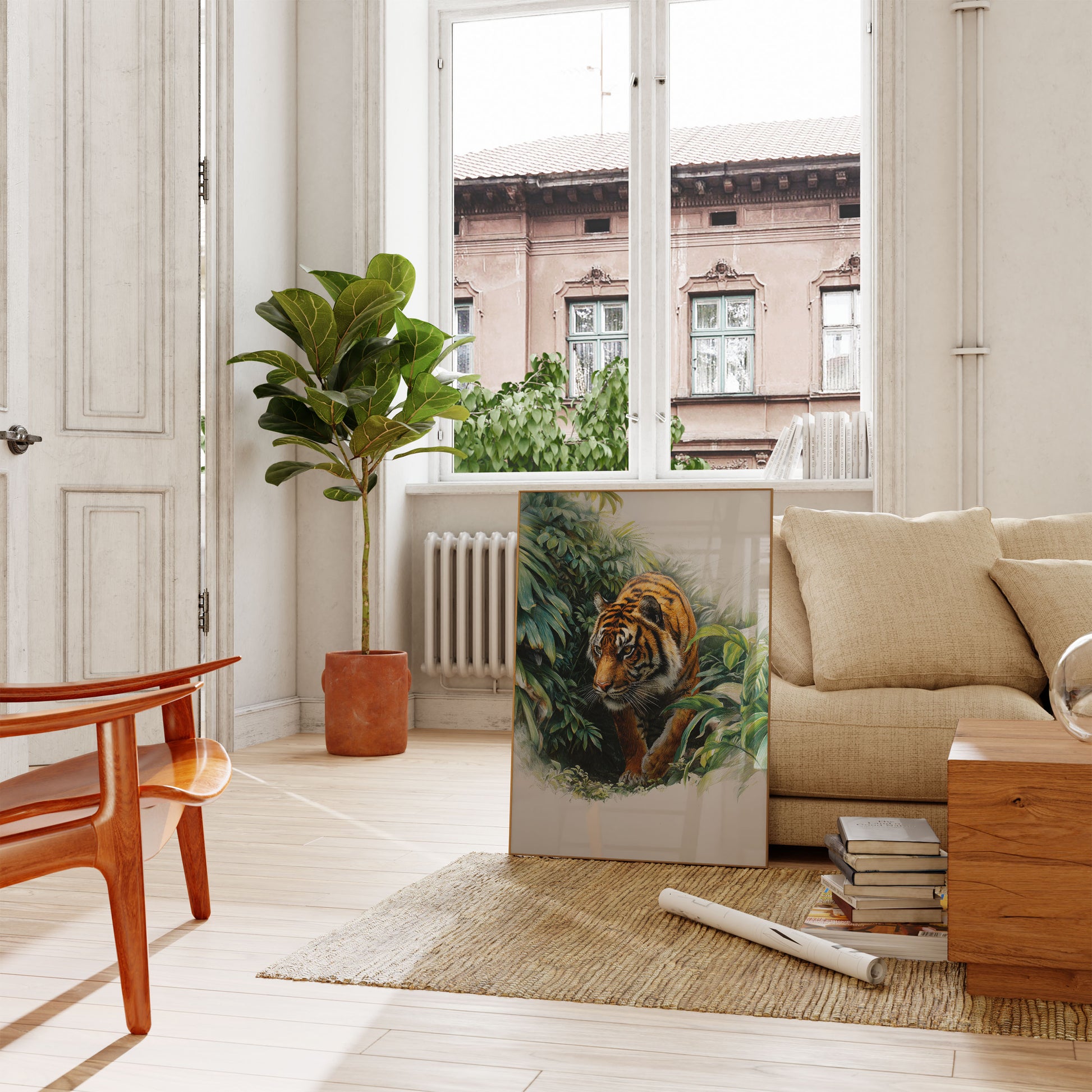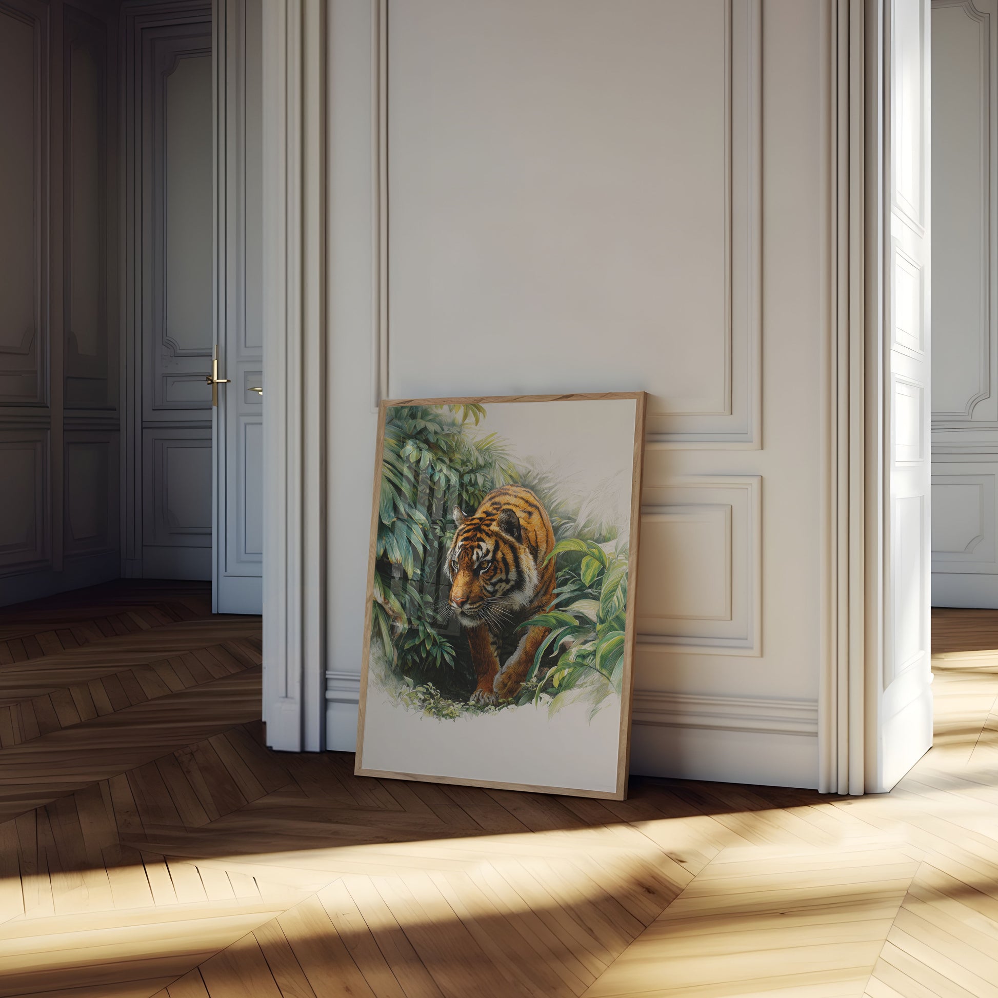 A breathtaking portrait of a majestic tiger prowling through lush tropical foliage, capturing the raw power and beauty of nature's most magnificent predator. The artwork brings to life the intense gaze and muscular form of the tiger, set against a vibrant green backdrop of intricate leaves and ferns. Every brushstroke reveals the incredible detail and emotional depth of this stunning wildlife scene.
