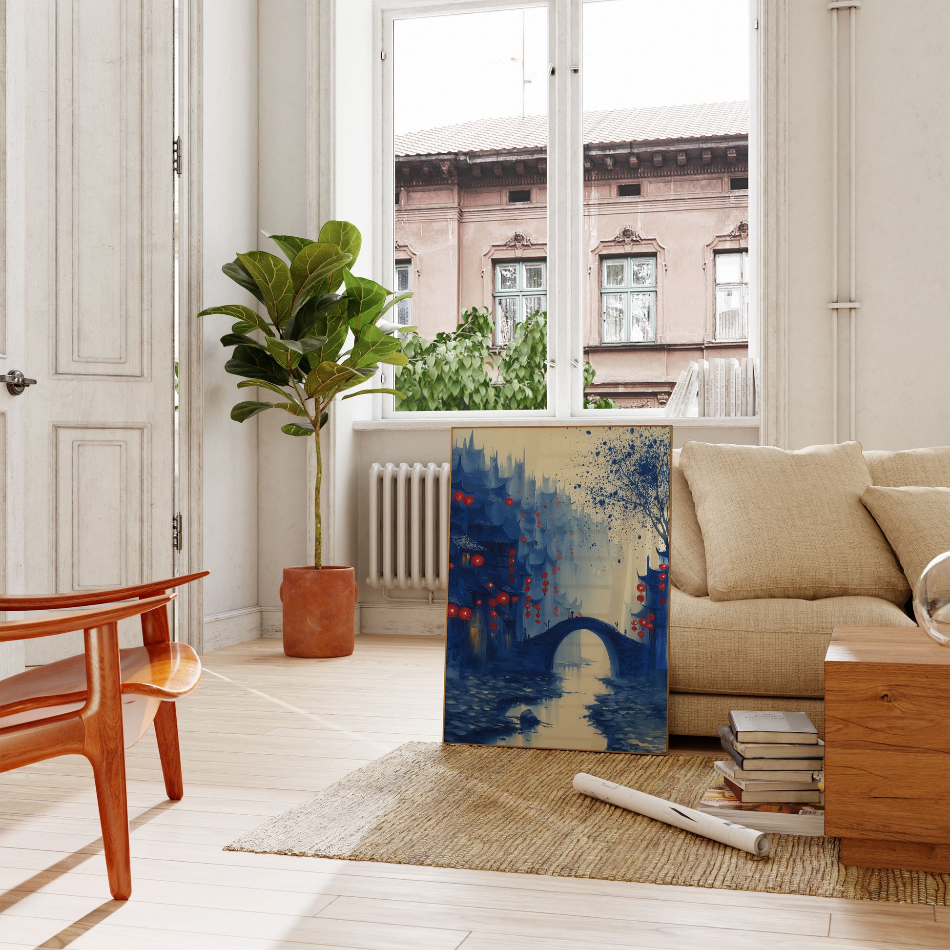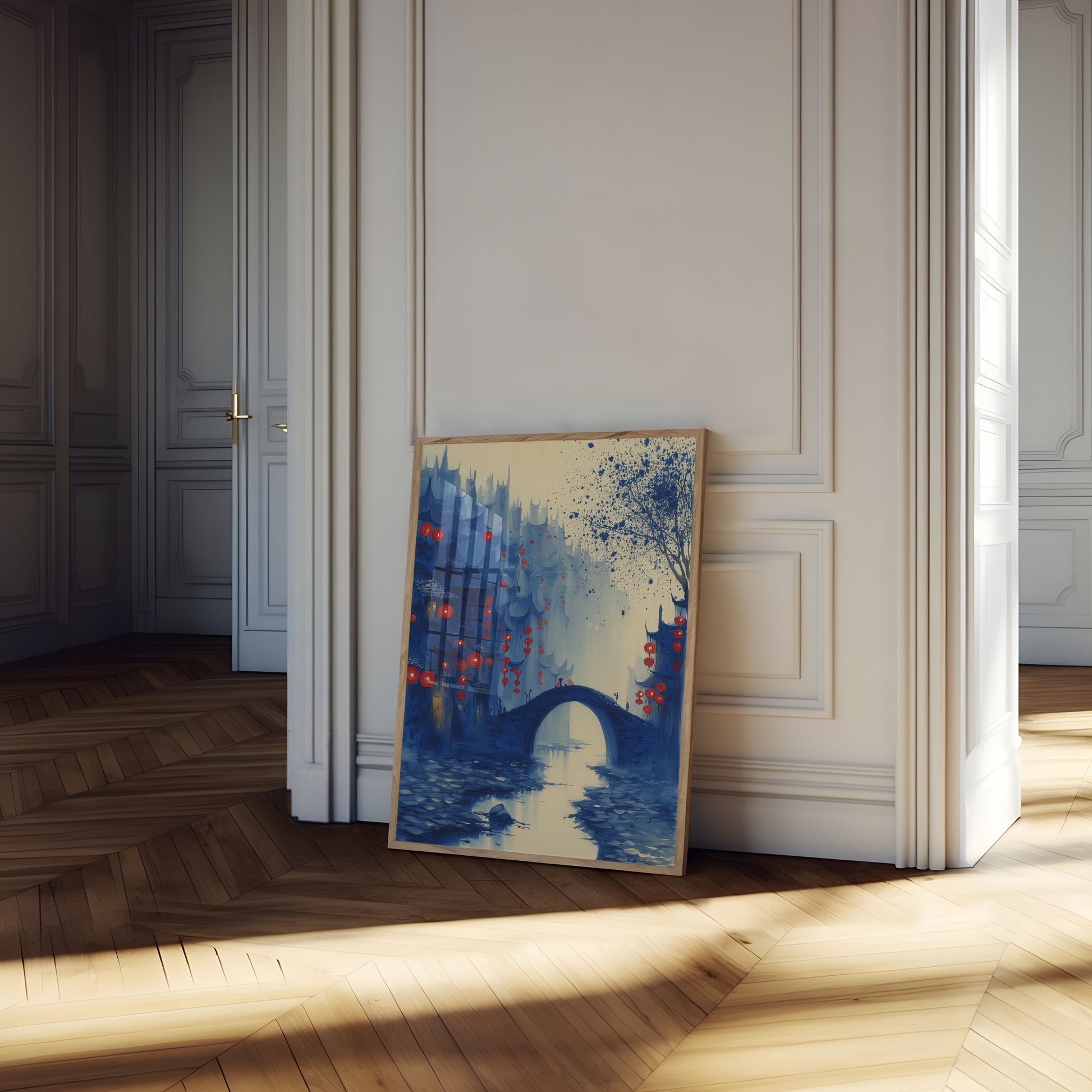 A mesmerizing cityscape emerges in deep blue tones, where ancient architectural silhouettes blend with a mysterious atmosphere. Vibrant red lanterns float like magical orbs, creating a dreamlike scene of an ethereal Asian-inspired landscape. The arched stone bridge and reflective water create a sense of tranquil beauty and timeless wonder.
