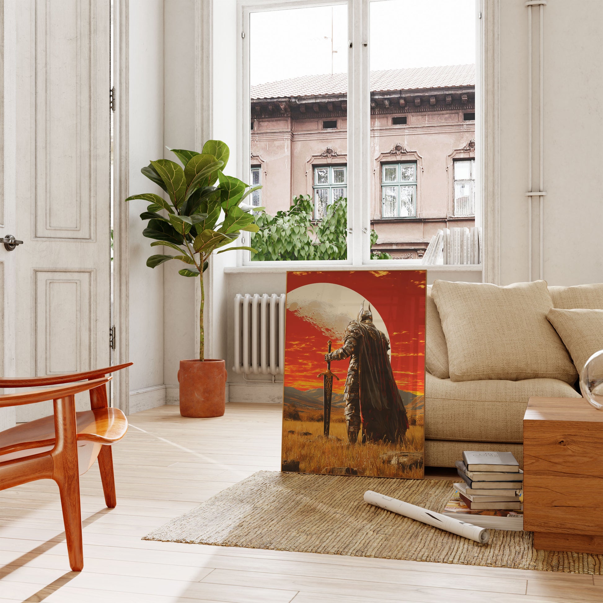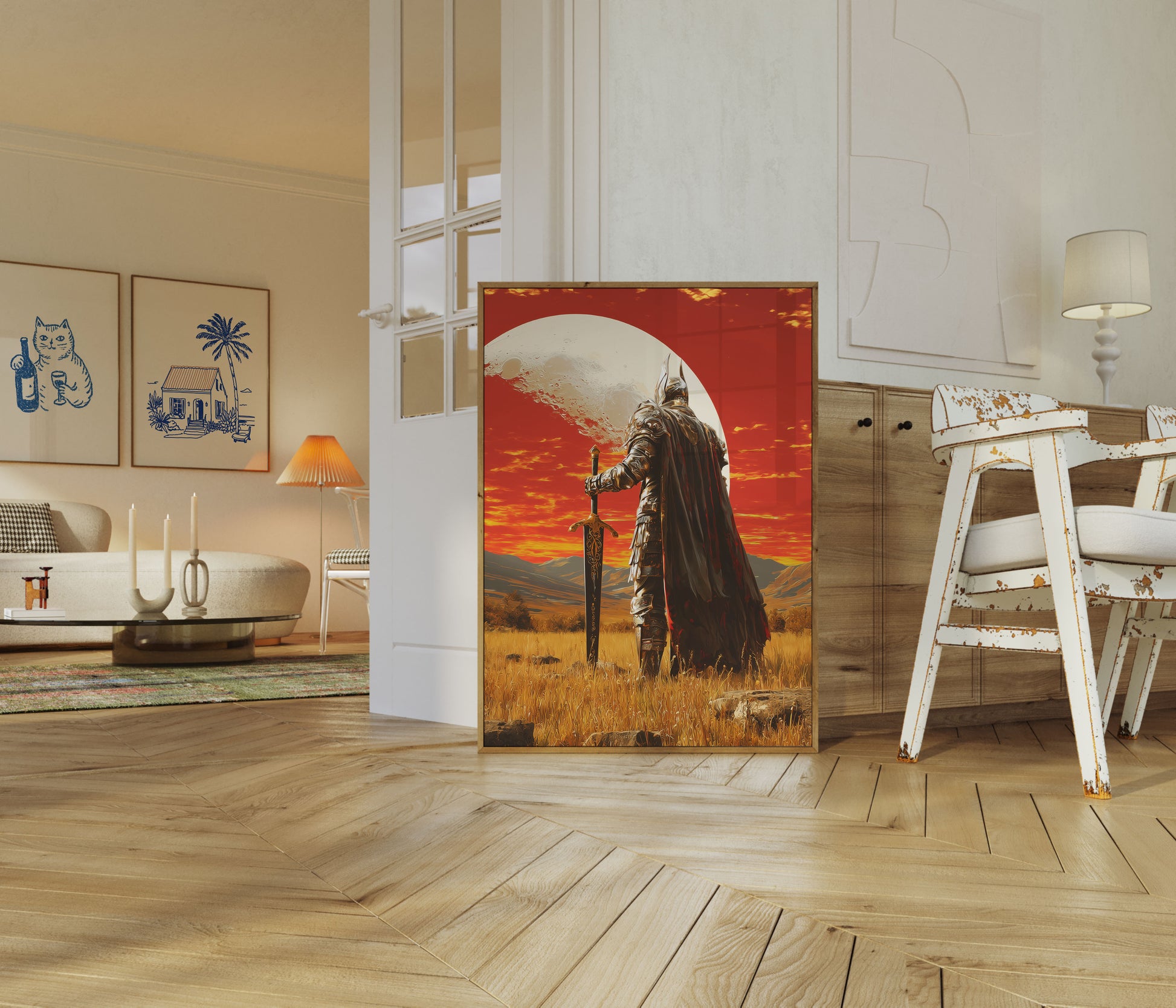 Step into a mystical world of heroic fantasy with this stunning artwork featuring a medieval knight standing resolute against a fiery crimson sunset. Adorned in intricate, layered armor and a dramatic flowing cape, the warrior grips an ornate sword while a massive moon looms in the background, creating an epic and atmospheric scene of power and solitude.