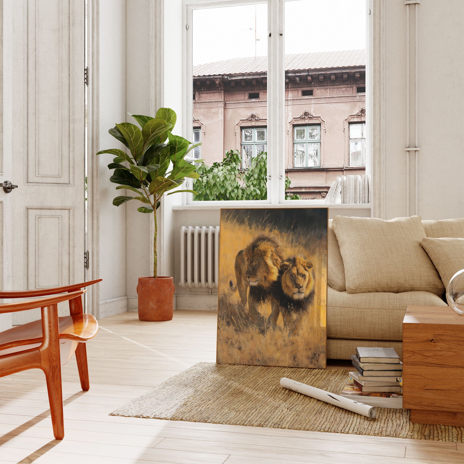 This stunning artwork captures a majestic lion and lioness moving through sun-drenched grasslands, their golden manes glowing in the warm light. The rich golden yellows and deep shadows create an atmosphere of raw power and natural beauty, while the intricate brushwork brings the savanna landscape to life. Perfect for wildlife enthusiasts, this piece evokes the majesty of African big cats in their natural habitat, blending realistic detail with an almost ethereal quality that draws you into the moment.