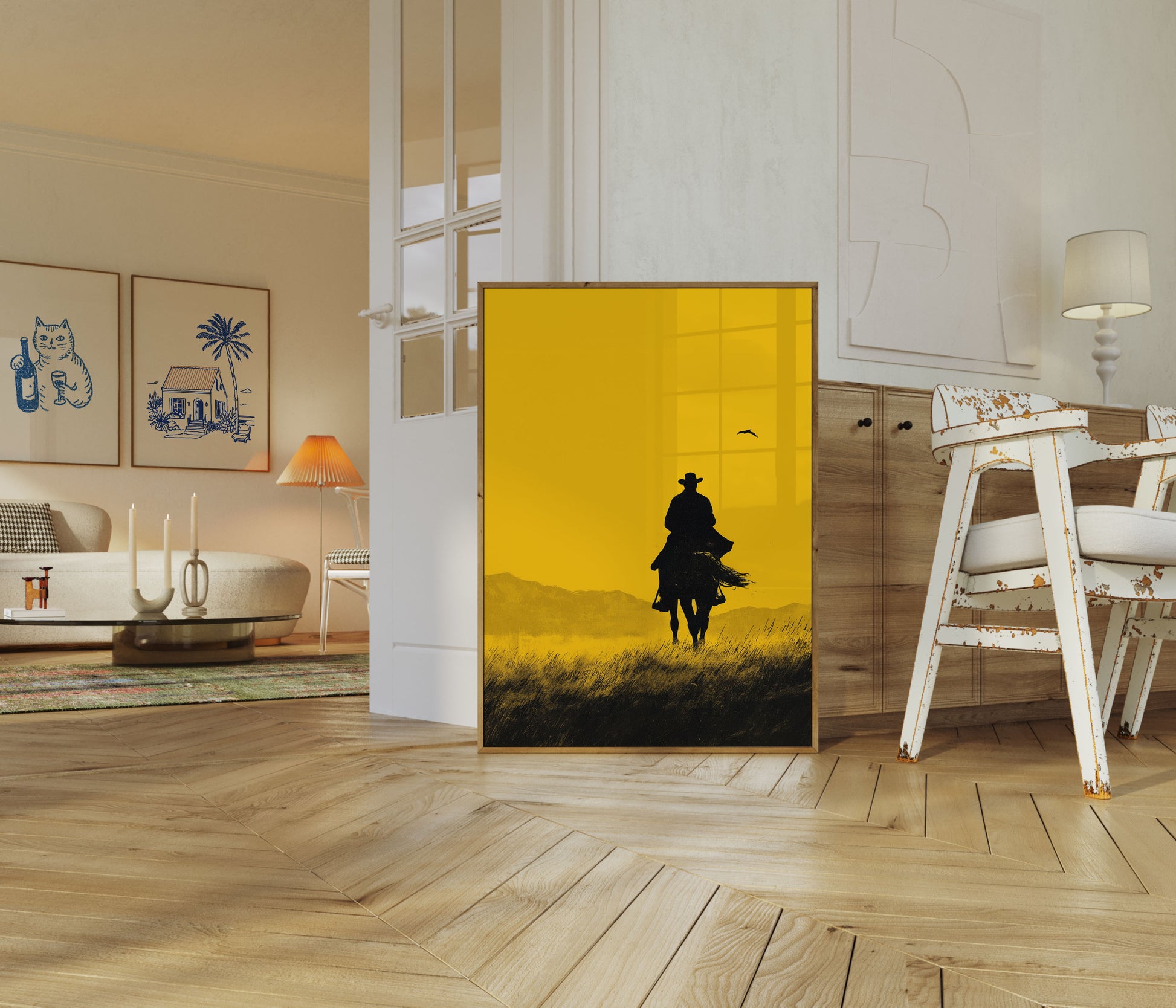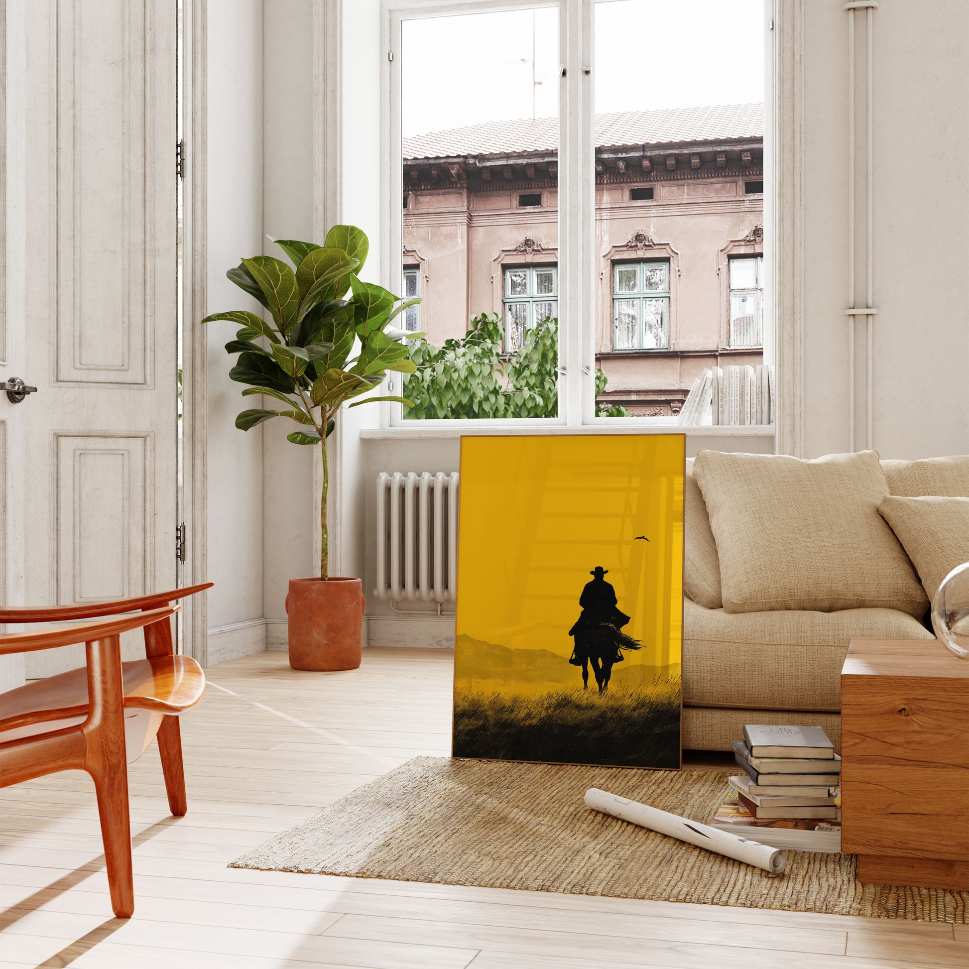 A striking silhouette of a cowboy on horseback rides into a vibrant yellow sunset, capturing the essence of the Wild West. The dramatic contrast between the black figure and the golden landscape creates a powerful, evocative scene of solitude and adventure. A lone bird soars in the distant sky, completing this iconic western imagery.