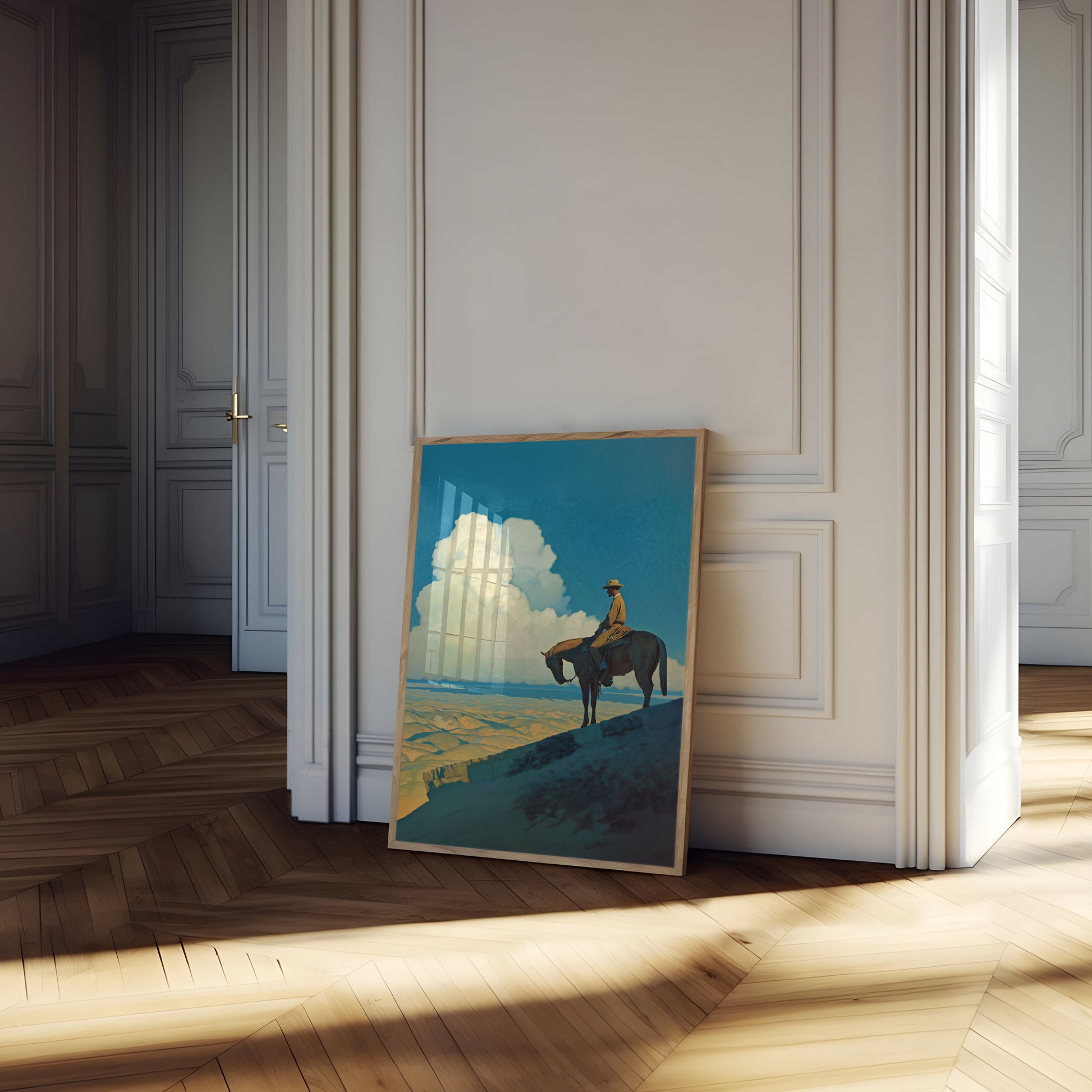 A breathtaking scene captures a solitary cowboy on horseback, perched on a rocky cliff overlooking a vast golden desert landscape. Billowing white clouds rise dramatically against a deep turquoise sky, creating a sense of expansive solitude and quiet contemplation. The artwork evokes the timeless spirit of the American West, with its stunning color palette and masterful composition.