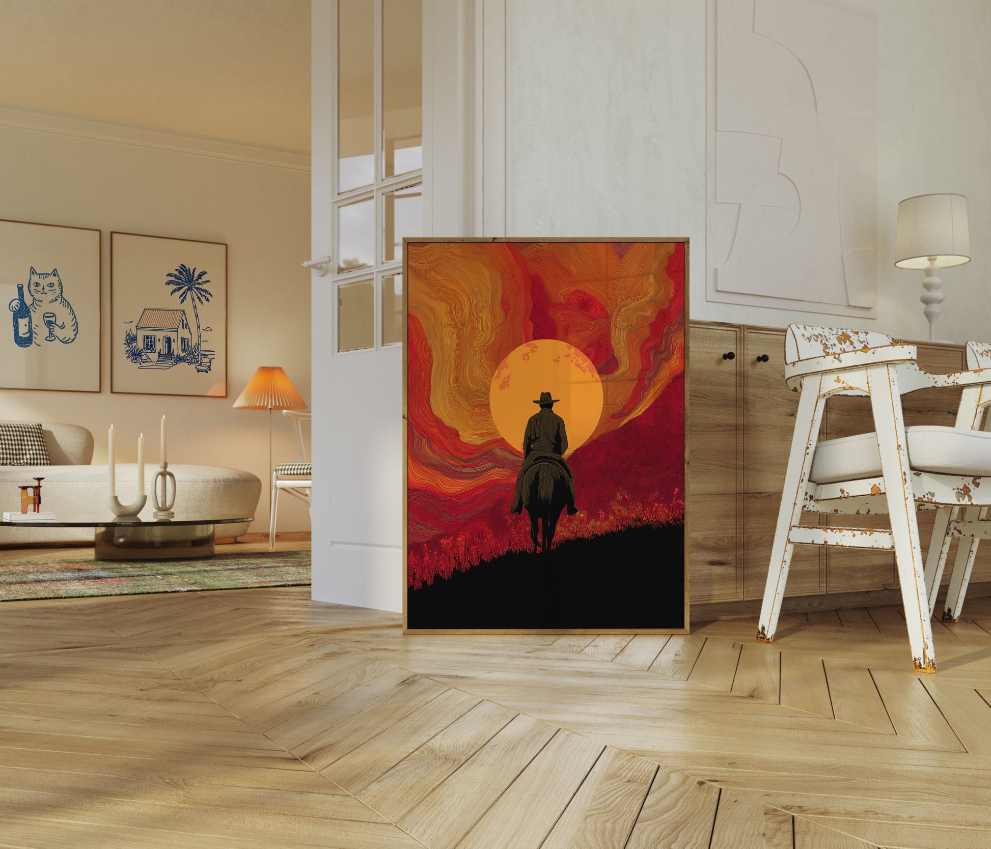 Experience the raw intensity of the Wild West with this stunning poster featuring a solitary cowboy on horseback silhouetted against a blazing orange sun. Swirling waves of deep red and golden hues create a mesmerizing backdrop that captures the untamed spirit of the frontier. The intricate, flowing lines of the landscape evoke a sense of movement and emotional depth.