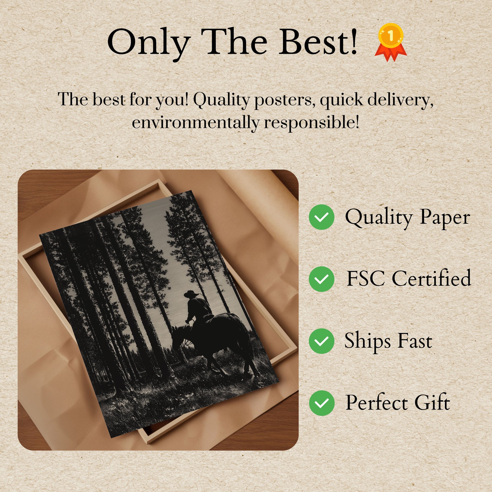 A striking black and white image captures a solitary rider on horseback navigating through a dense pine forest. The silhouetted figure in a wide-brimmed hat creates a sense of quiet mystery and wilderness adventure, with tall evergreen trees framing a soft, textured background. This atmospheric artwork evokes the timeless spirit of exploration and the tranquil beauty of untouched landscapes.