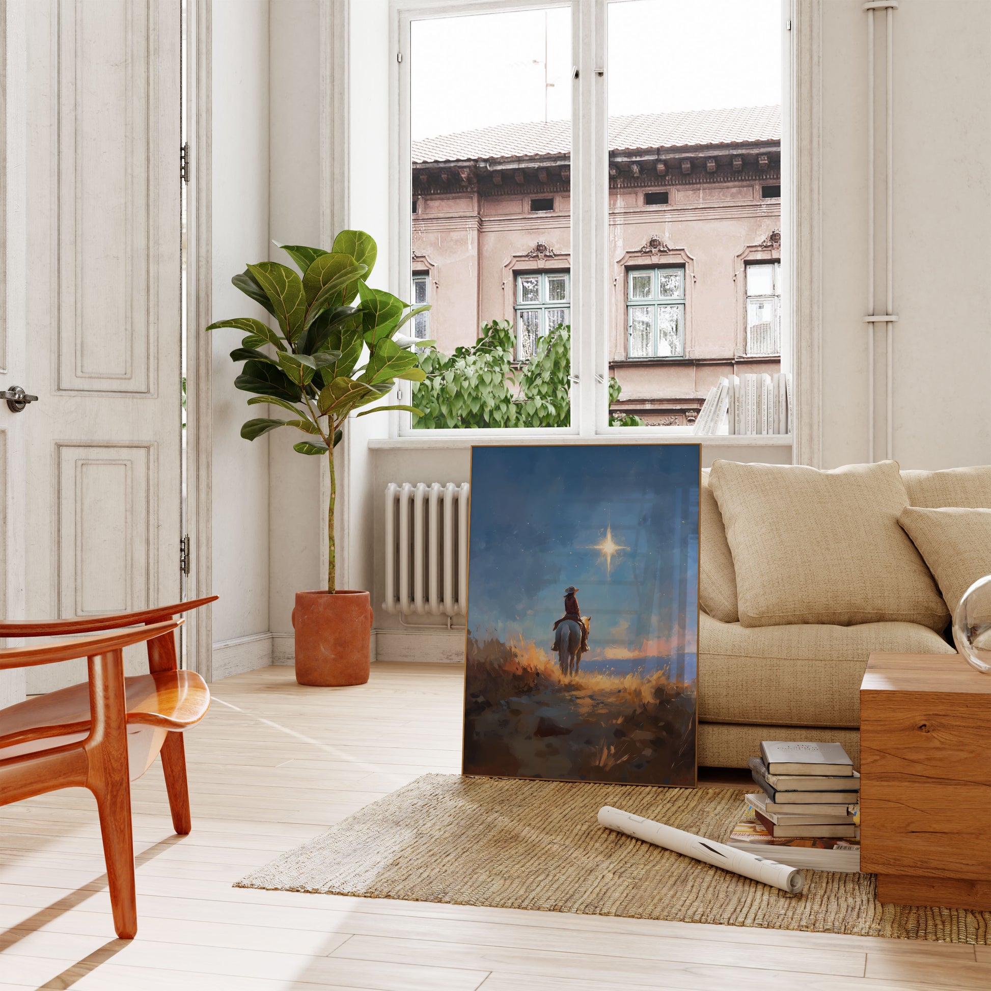 A breathtaking artwork captures a solitary cowboy riding a white horse beneath a brilliant celestial star. The painting evokes a sense of mystery and wonder, with warm golden grasslands contrasting against a deep blue starry sky. A luminous star shines brightly, casting an ethereal light on the rider's solitary path.