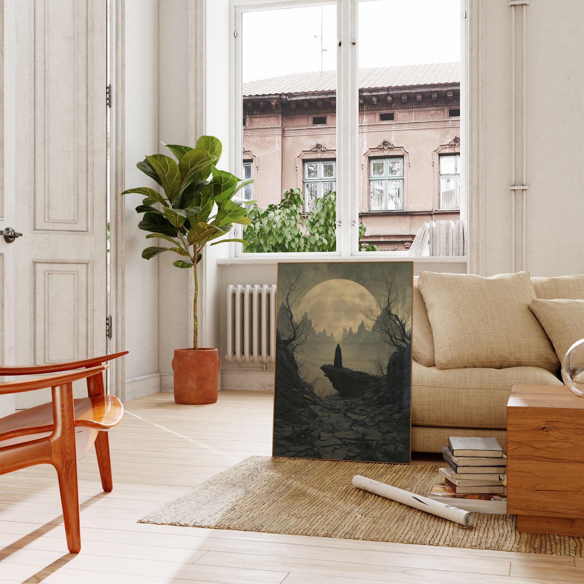 A haunting landscape emerges under an enormous full moon, where a solitary cloaked figure stands on a rocky outcropping amidst twisted, bare trees and jagged mountain peaks. The muted gray-green palette creates an atmosphere of profound solitude and mysterious contemplation, inviting viewers into a realm between reality and imagination.