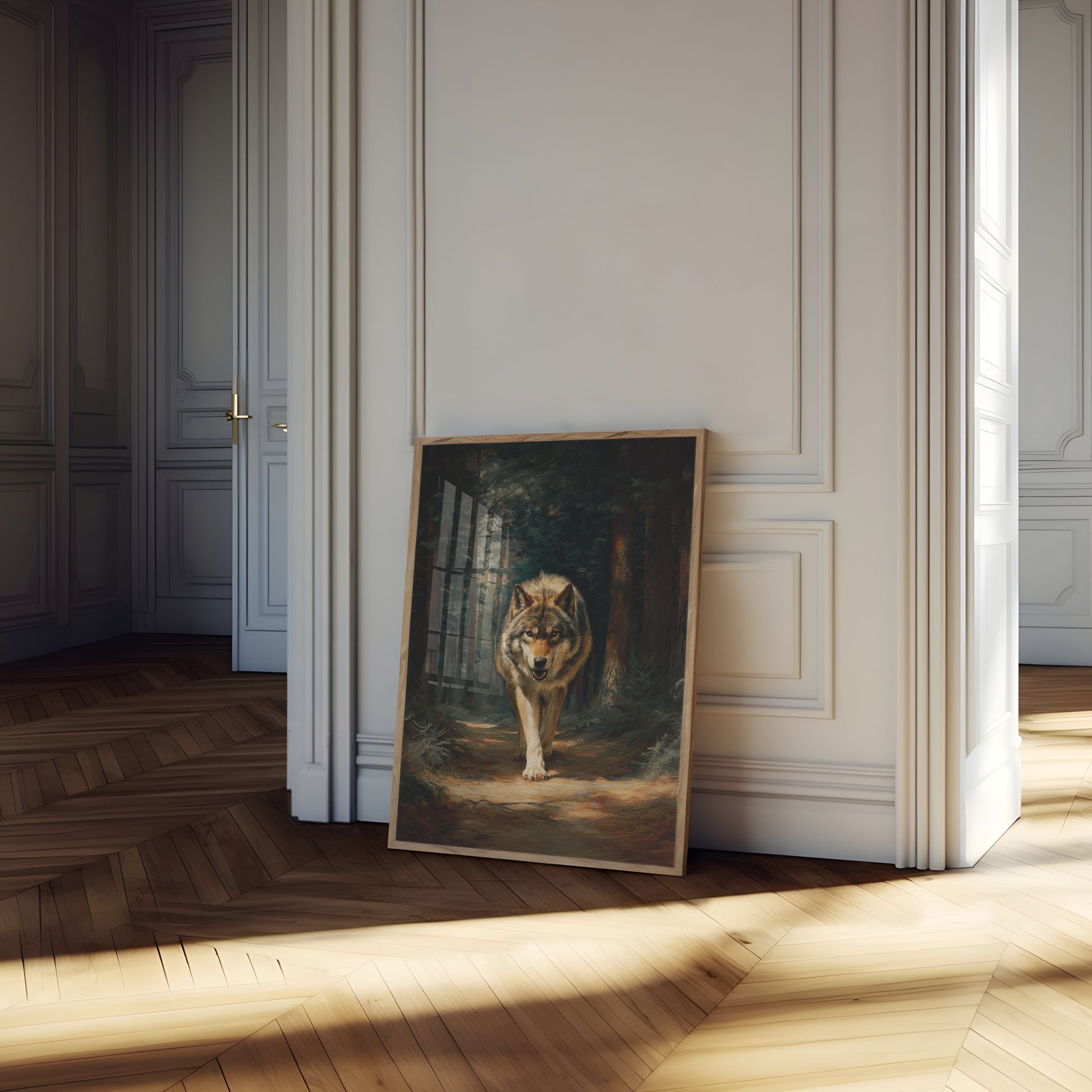 Capture the raw, primal essence of wilderness with this stunning wolf portrait set in a moody, shadowy forest. The fierce predator advances purposefully along a sunlit forest path, its golden-gray fur illuminated against the dark, mystical woodland backdrop. Every brushstroke reveals the wolf's intense gaze and powerful presence, inviting viewers into a world of untamed natural beauty and raw animal magnetism.