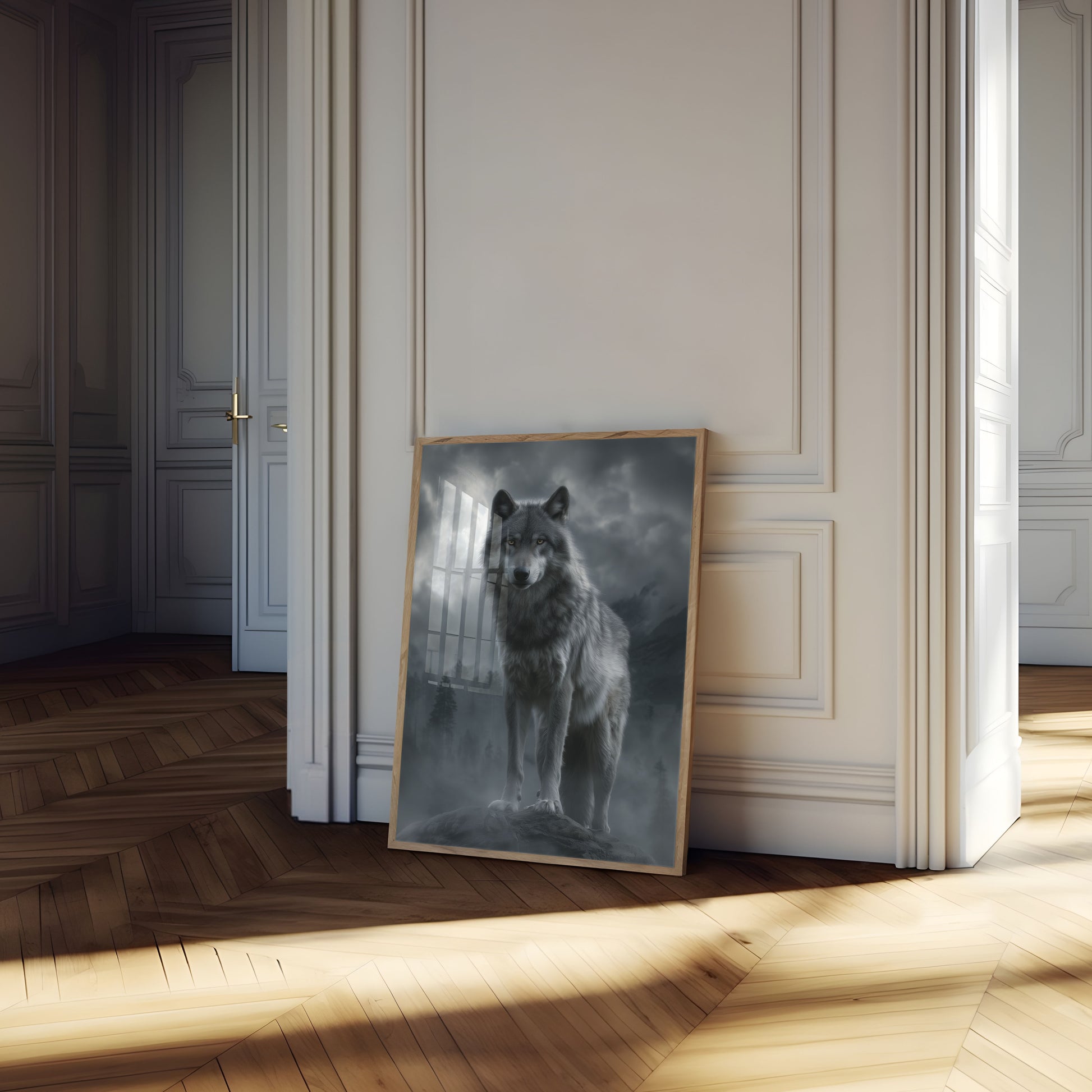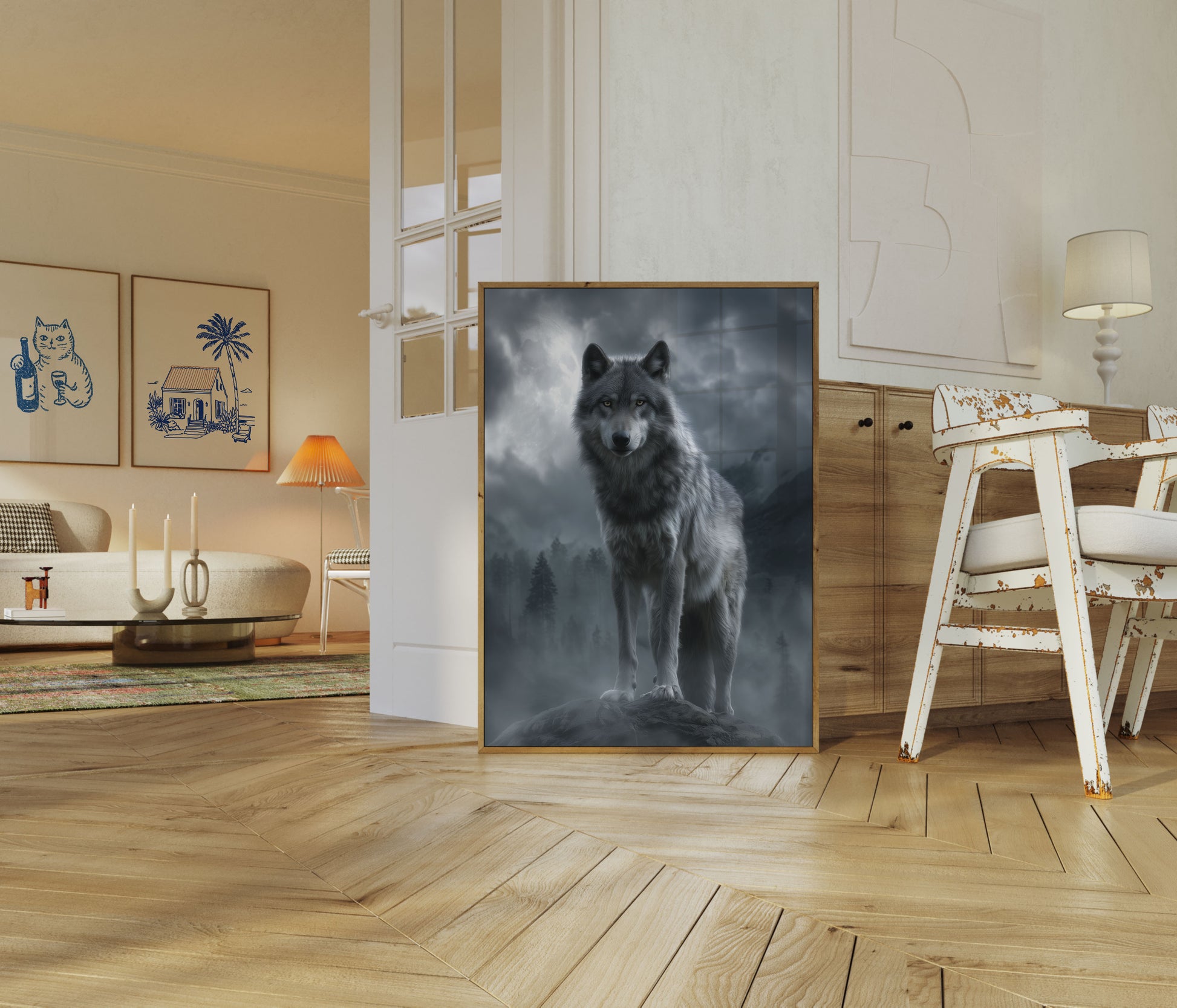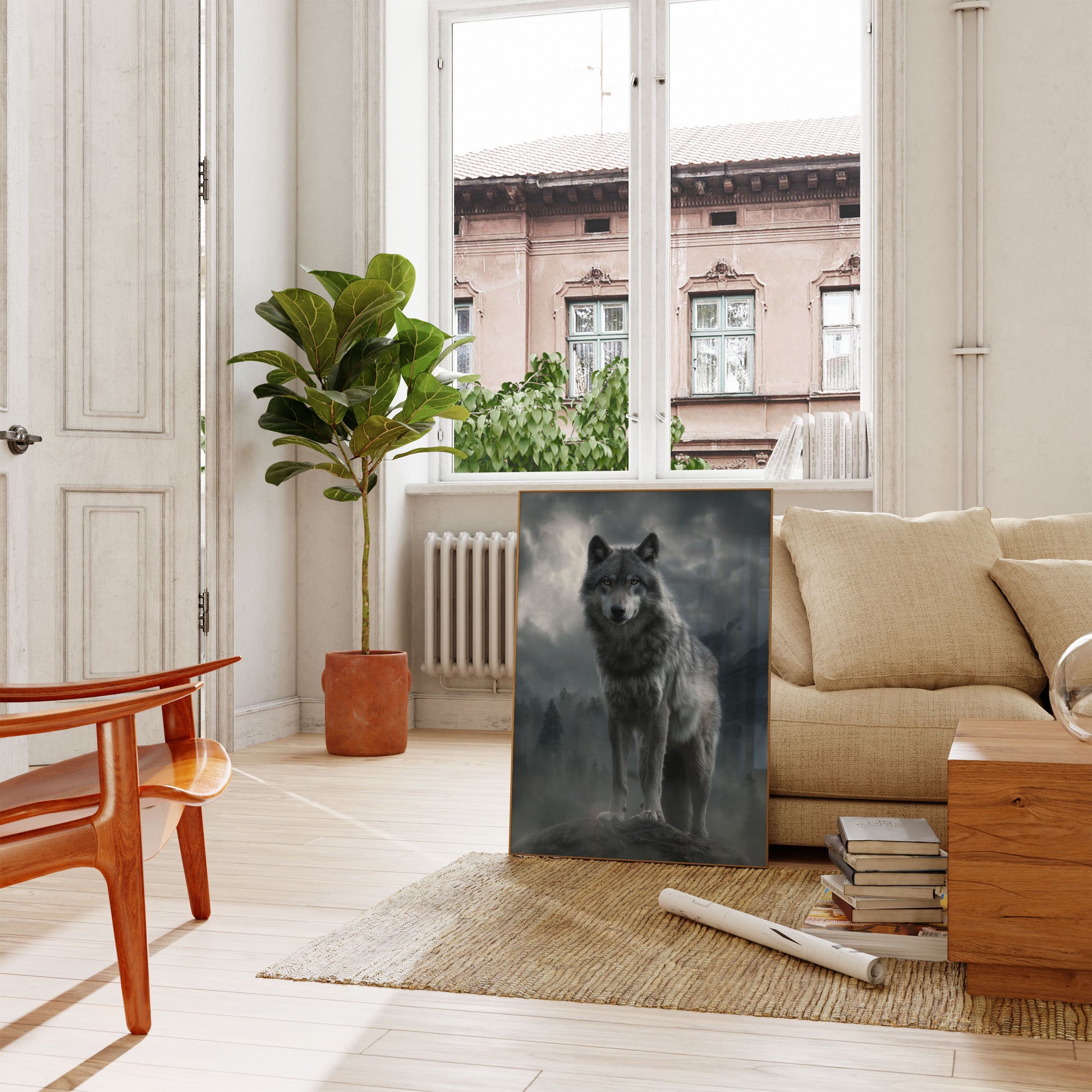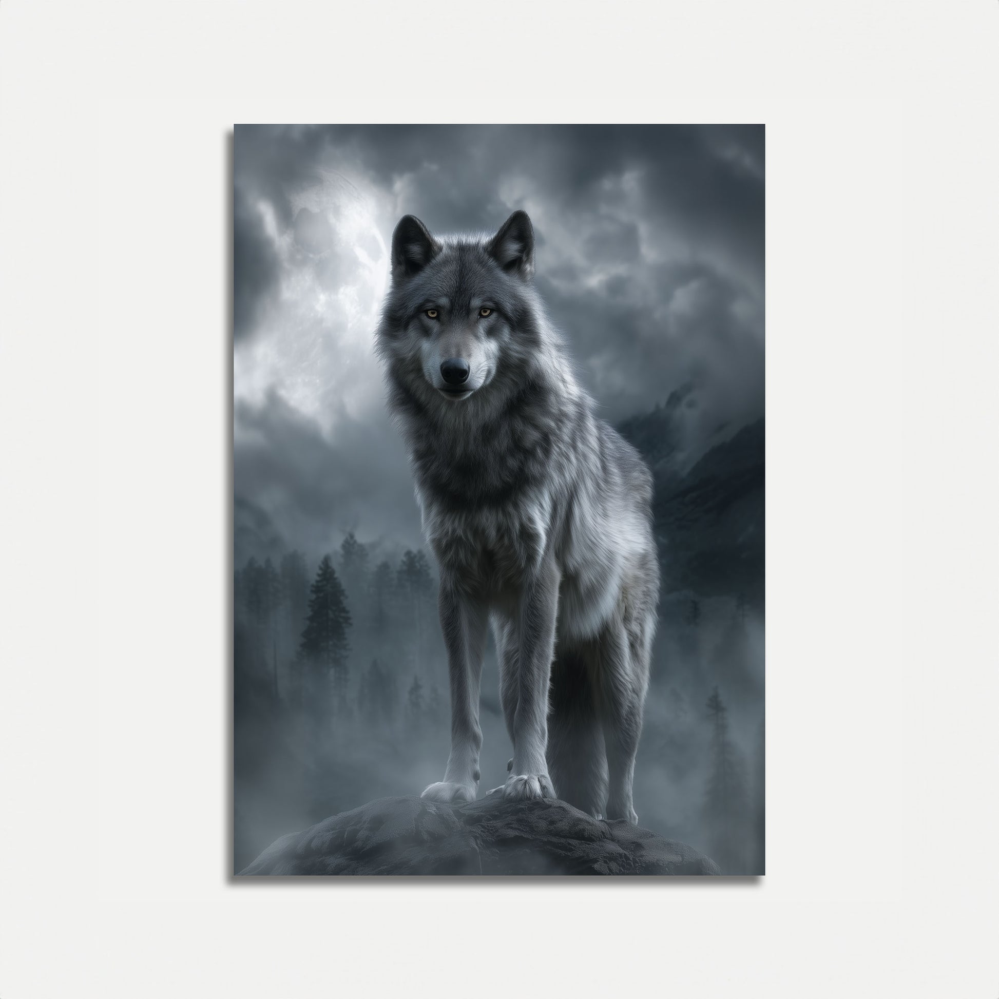 Stand face-to-face with raw wilderness in this stunning gray wolf portrait. Set against a moody, misty mountain backdrop, this magnificent creature commands attention with piercing golden eyes and a majestic stance atop a rocky outcrop. The atmospheric grayscale palette captures the wolf's wild spirit and untamed essence, creating a powerful visual narrative of strength and solitude.