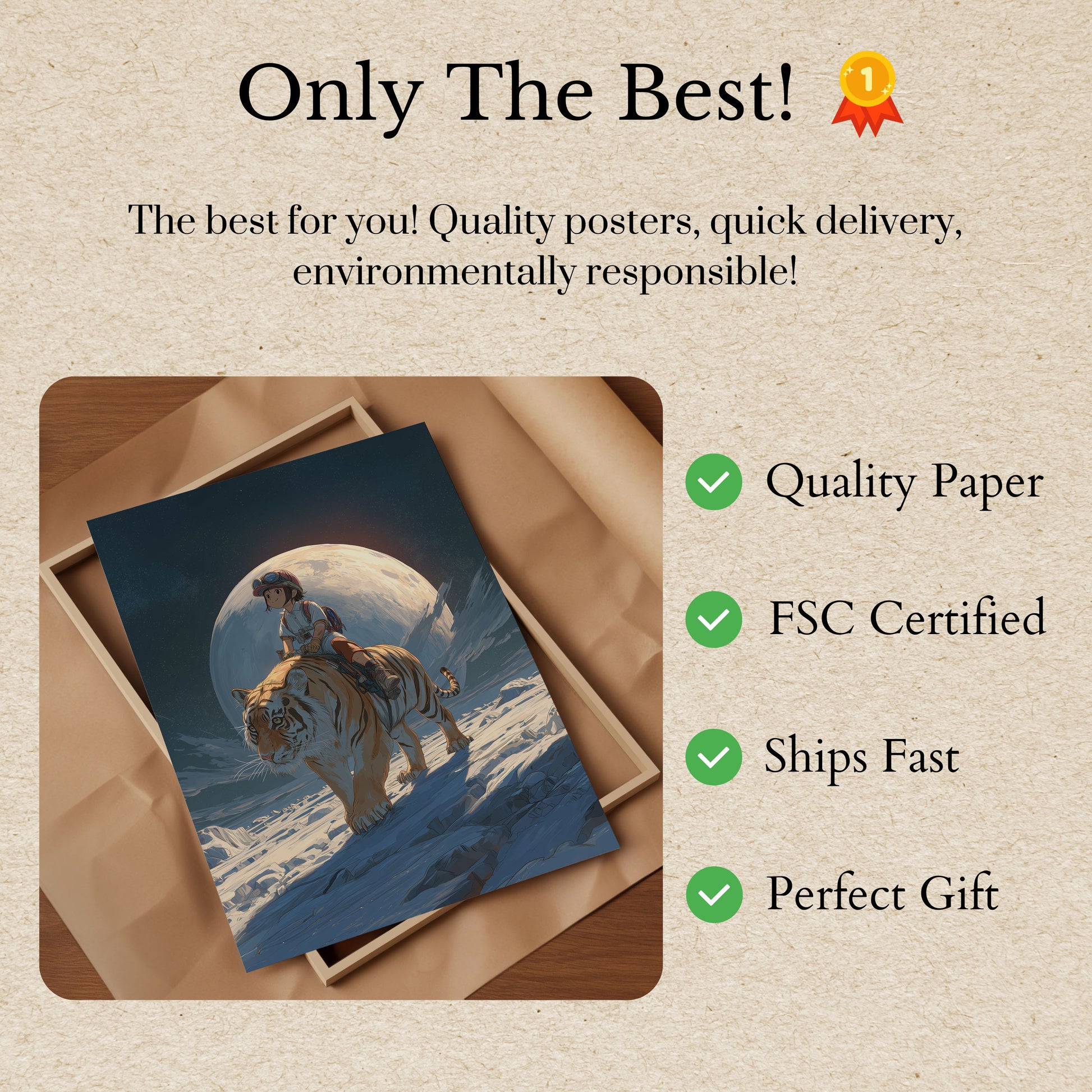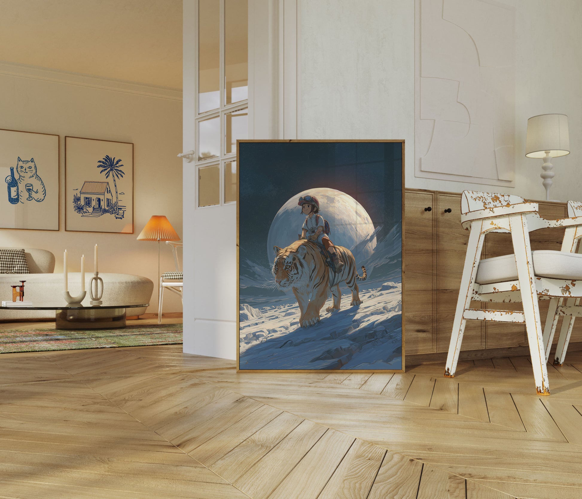 In a breathtaking landscape of icy terrain and starlit skies, a young adventurer rides atop a majestic tiger beneath an enormous glowing moon. This stunning illustration captures a moment of extraordinary companionship, blending science fiction and natural wonder into a single, powerful image. The detailed artwork showcases a surreal journey across a frozen, rocky landscape where imagination and reality beautifully intersect.