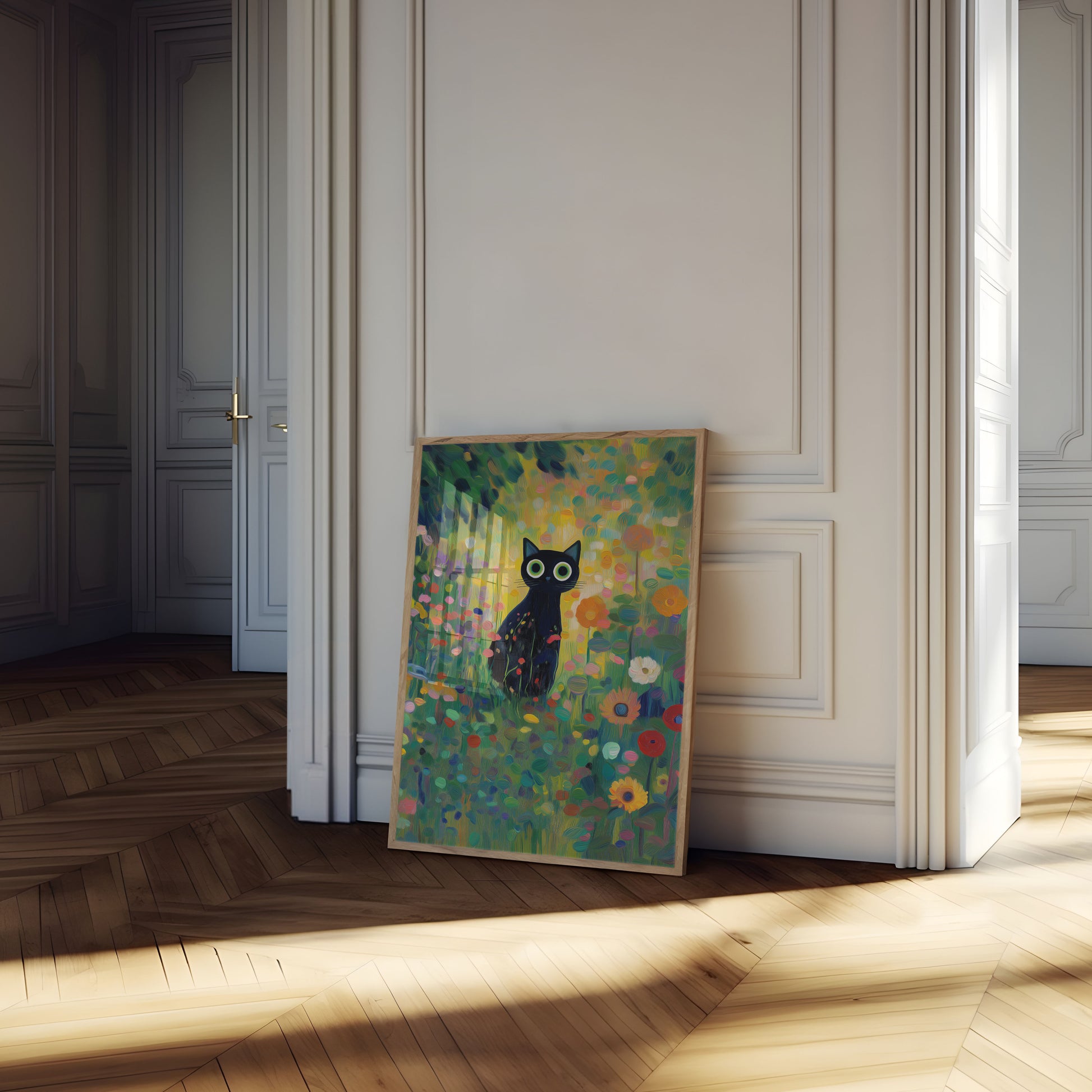 A mesmerizing artwork featuring a sleek black cat with luminous green eyes sitting amidst a vibrant, impressionistic garden explosion of colors. Delicate flowers in soft yellows, oranges, greens, and pinks swirl around the cat, creating a dreamlike and enchanting scene that captures the mysterious essence of feline grace and natural beauty.