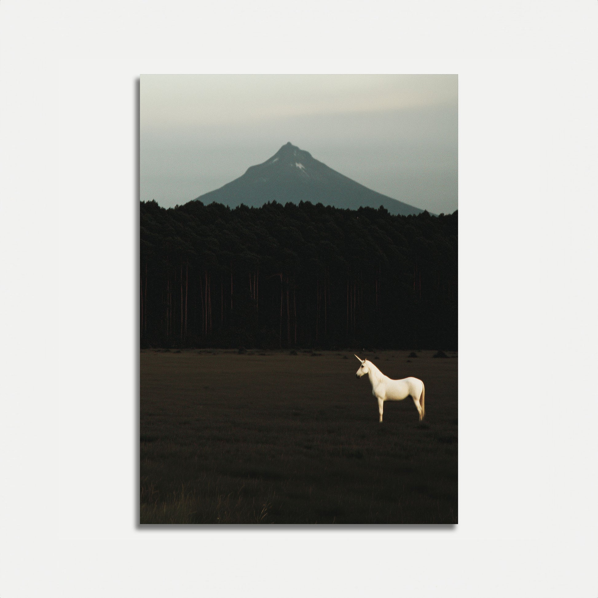 A lone white unicorn stands in peaceful solitude against a misty mountain landscape, creating a dreamlike scene of ethereal beauty. The contrast between the luminous mythical creature and the dark forest beneath a towering peak evokes a sense of mystery and wonder.