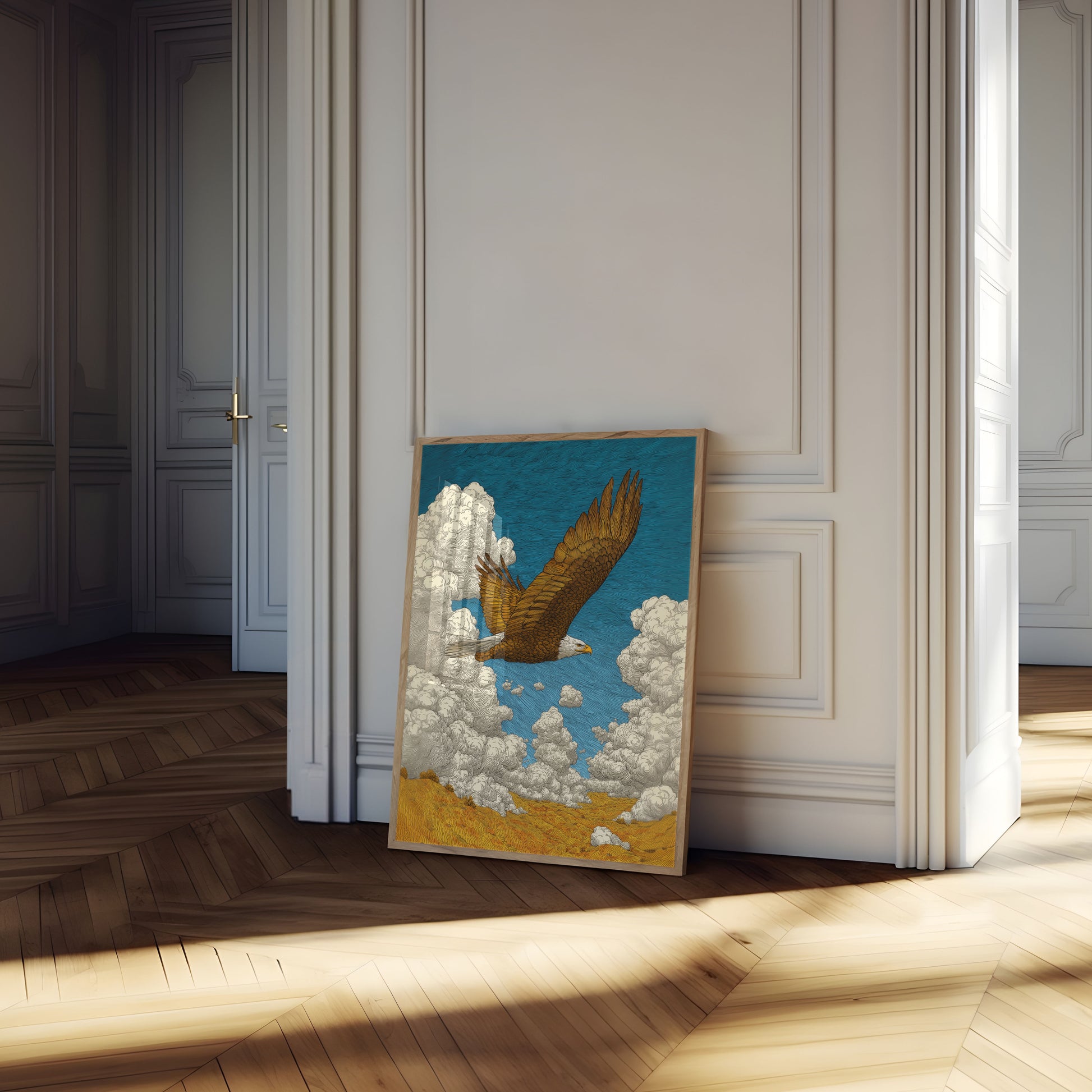 A stunning illustration captures an eagle in mid-flight, its golden-brown feathers gleaming against a vibrant blue sky. Intricate white clouds swirl around the powerful bird, creating a dramatic and dynamic scene that celebrates the raw beauty of wildlife and nature. The detailed artwork brings the eagle's strength and grace to life with remarkable precision.