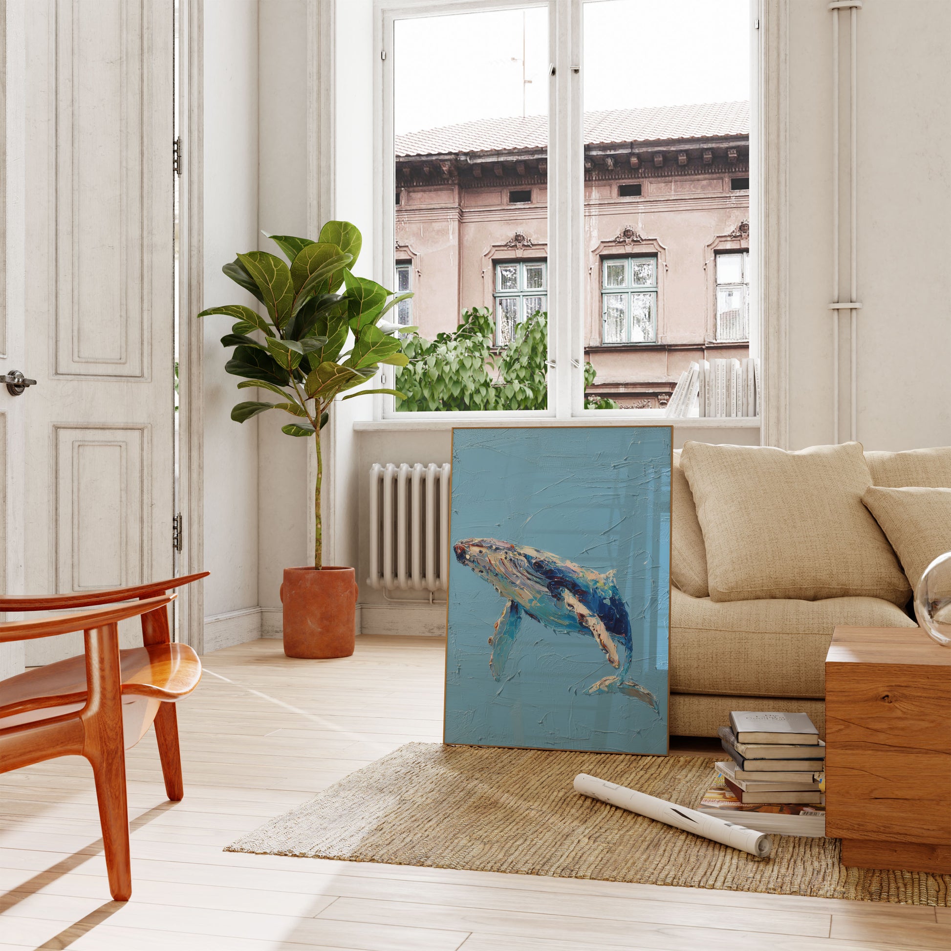 Dive into the mesmerizing world of marine art with this stunning whale portrait, rendered in a vibrant palette of blues and whites. The textured oil painting captures the graceful movement and powerful presence of a whale, seemingly suspended in a tranquil, azure ocean. Rich brushstrokes and dynamic color layers bring this magnificent marine creature to life with incredible depth and emotion.