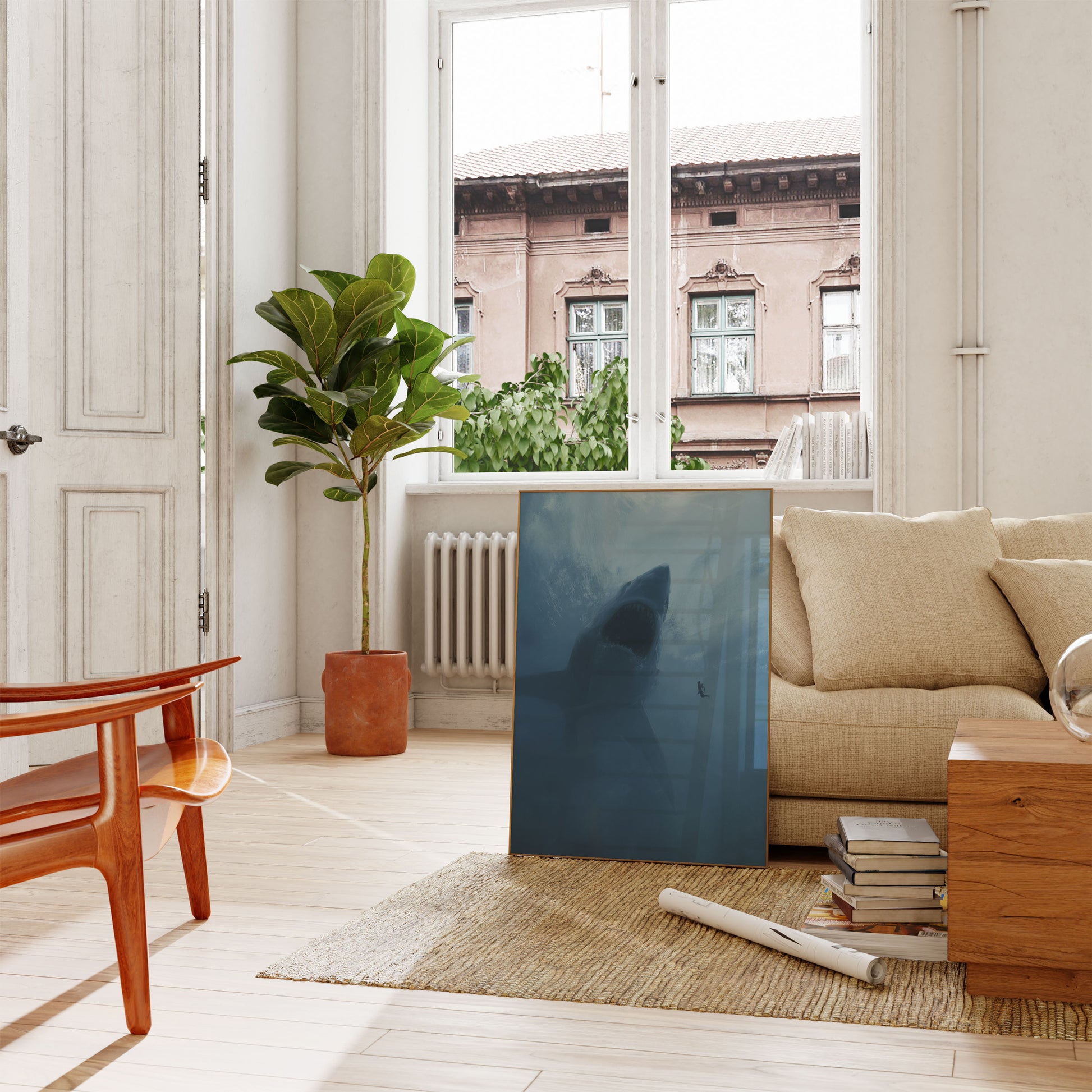 Dive into the heart-stopping depths of marine tension with this stunning underwater scene featuring a colossal shark towering over a tiny diver. The icy blue tones create a haunting atmosphere of primal fear and vulnerability, capturing the raw power of the ocean's most legendary predator. Every detail of this dramatic composition invites viewers into a momentary suspension between survival and certain doom.