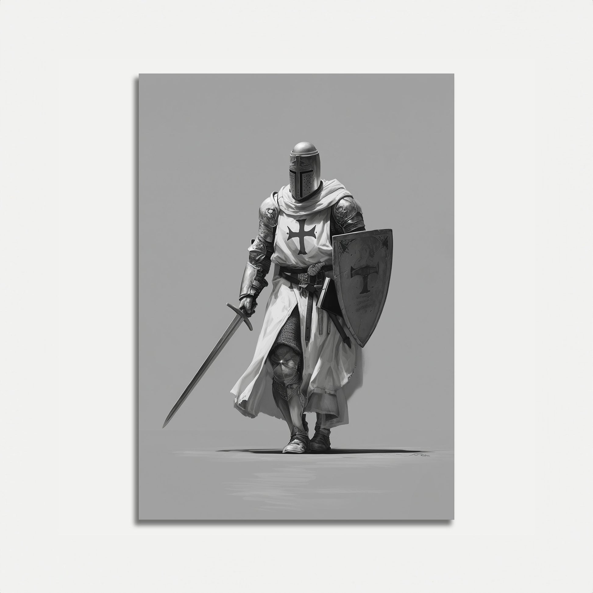 Step into the world of medieval warfare with this stunning black and white illustration of a Templar knight. Clad in gleaming armor and a flowing white surcoat bearing the distinctive cross, the knight stands resolute, sword and shield at the ready. Every intricate detail captures the strength, nobility, and martial spirit of the medieval warrior.