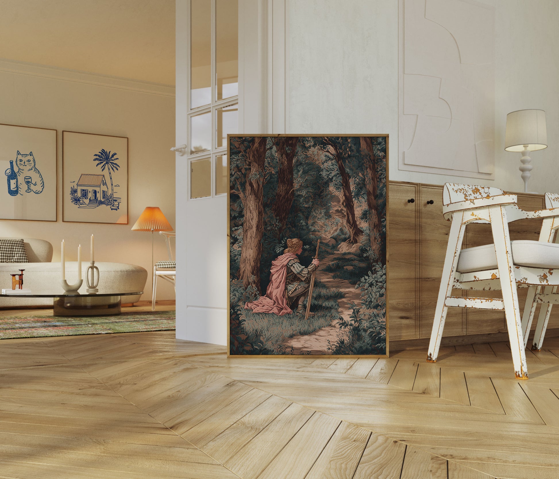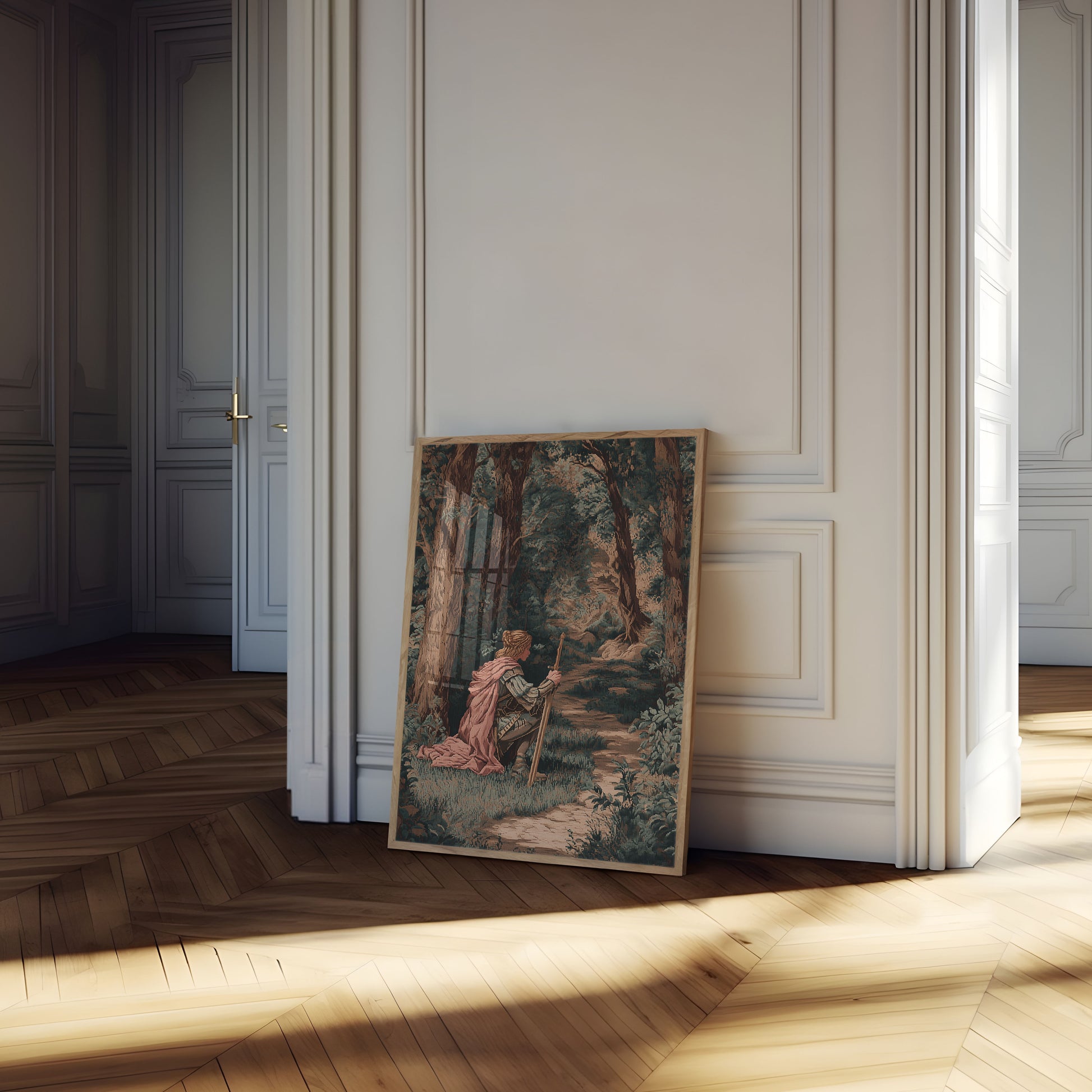 Step into a mystical forest landscape where a knight in armor kneels quietly along a winding woodland path. Soft pink cape draped elegantly, the figure stands sentinel among towering trees, creating an atmosphere of quiet contemplation and medieval mystery. The tapestry-like texture and muted green-brown palette evoke a sense of ancient storytelling and heroic solitude.