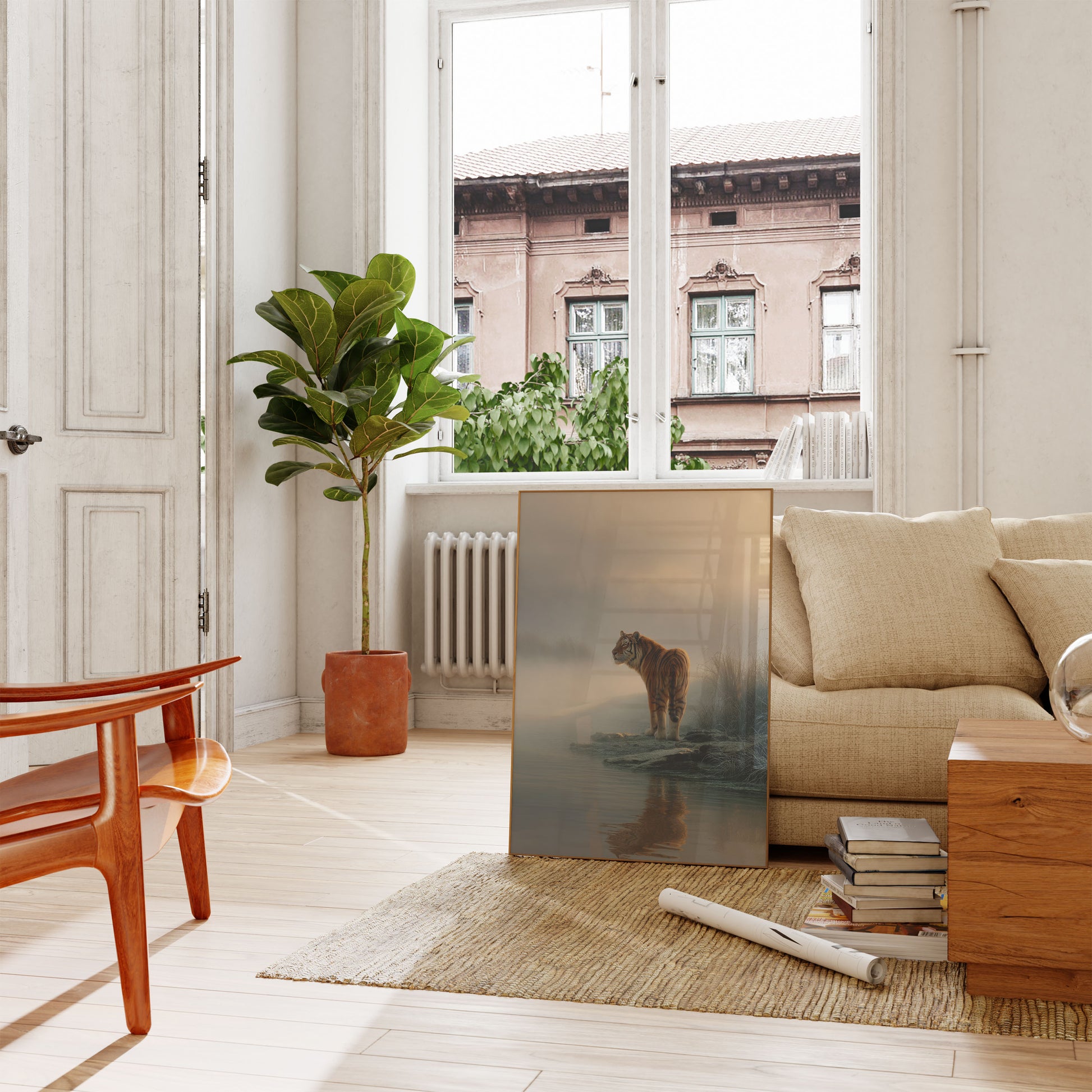 A magnificent tiger stands silhouetted against a soft, ethereal landscape, its powerful form reflected in the tranquil waters below. The gentle morning mist envelops the scene, creating a breathtaking moment of serene wilderness that captures the majestic beauty of this iconic predator. Soft golden and blue-green hues blend seamlessly, transforming this wildlife scene into a mesmerizing work of art.