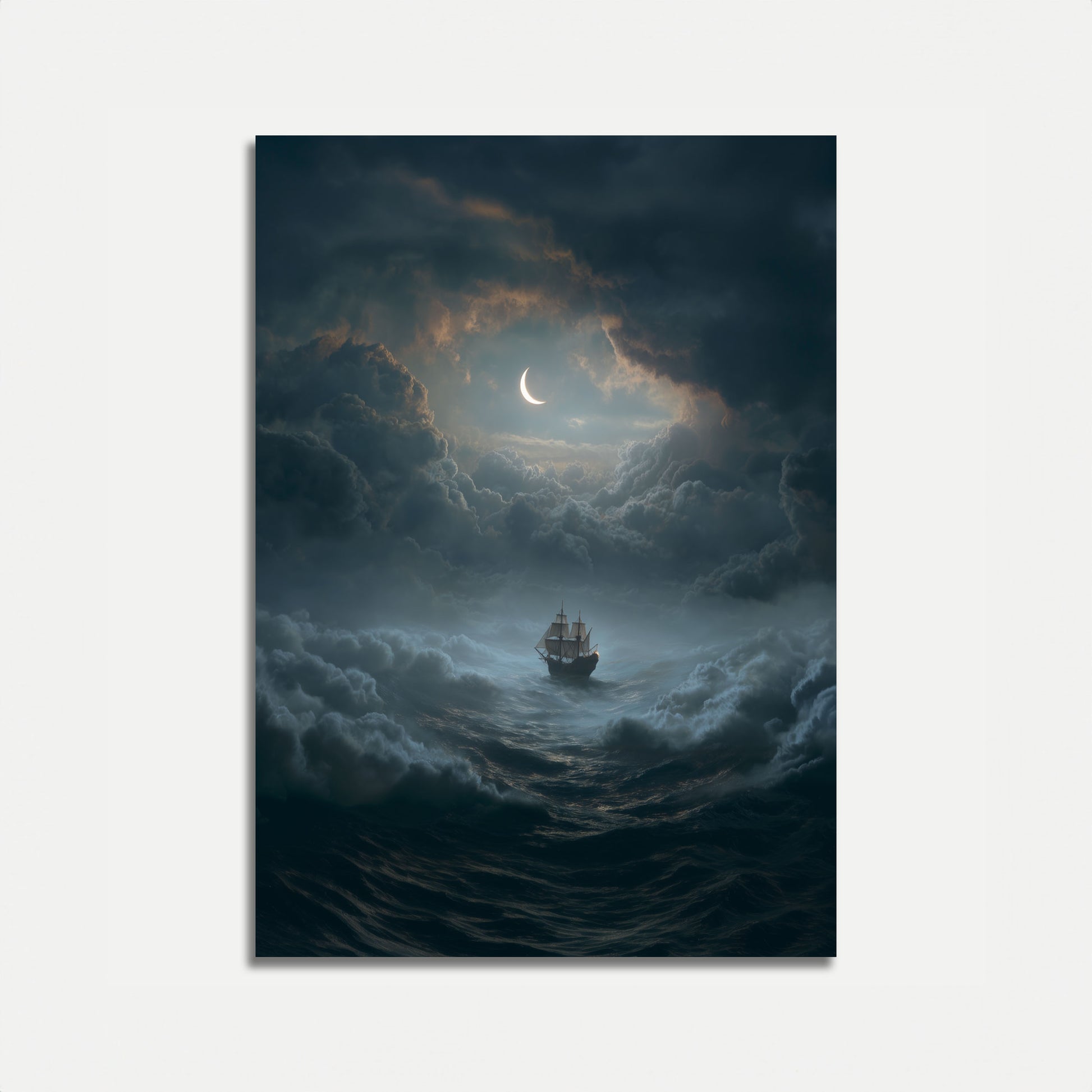 A mesmerizing seascape captures a solitary sailing ship navigating through turbulent, cloud-laden waters under the ethereal glow of a crescent moon. Dramatic storm clouds part just enough to reveal the luminous lunar light, creating a haunting and mysterious maritime scene that evokes tales of adventure and isolation. The vessel seems both vulnerable and resilient against the powerful, swirling oceanic landscape.