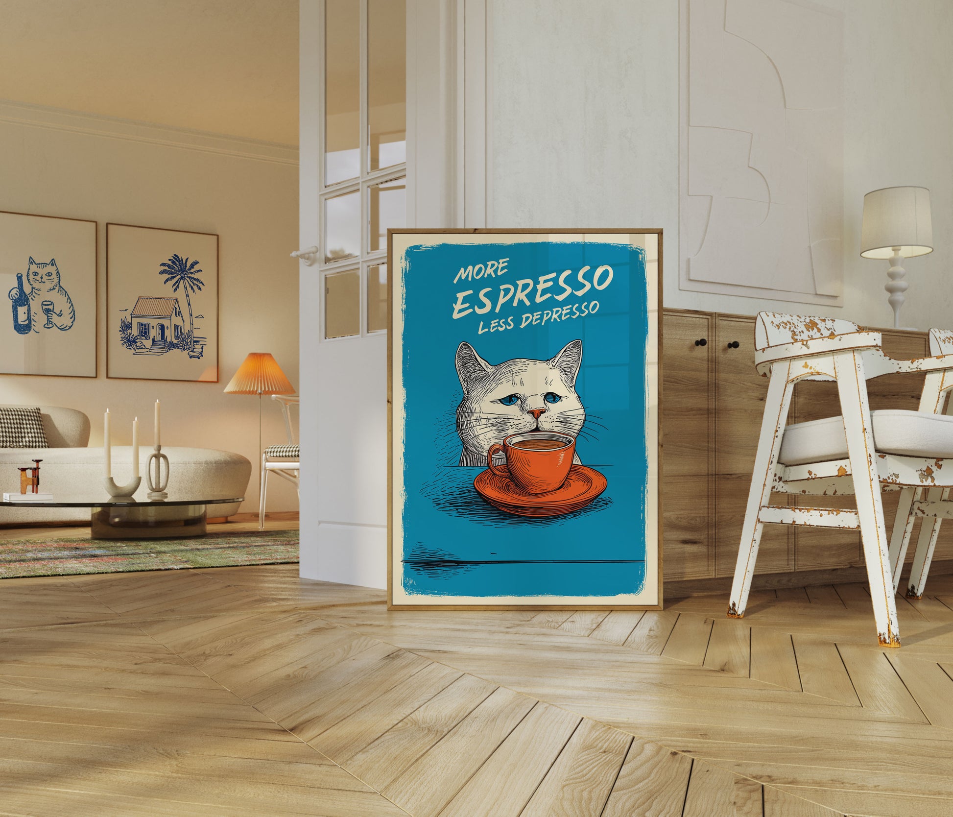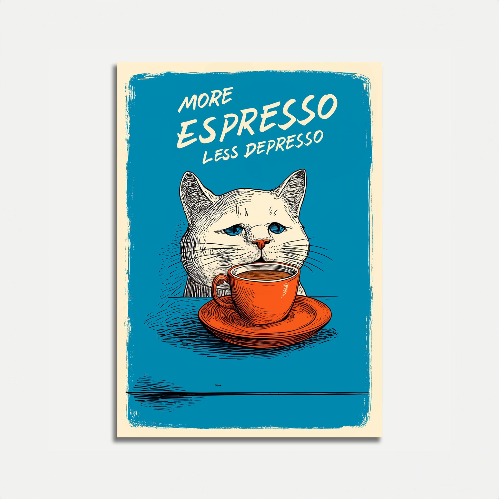 Dive into the delightful world of coffee humor with this charming blue and orange poster featuring a stoic white cat and a vibrant espresso cup. The witty slogan 'More Espresso Less Depresso' pairs perfectly with the cat's deadpan expression, creating a playful and mood-lifting piece of art that's sure to bring a smile to coffee lovers and cat enthusiasts alike. The bold color palette and vintage-style illustration make this poster a standout piece for any kitchen, cafe, or living space.