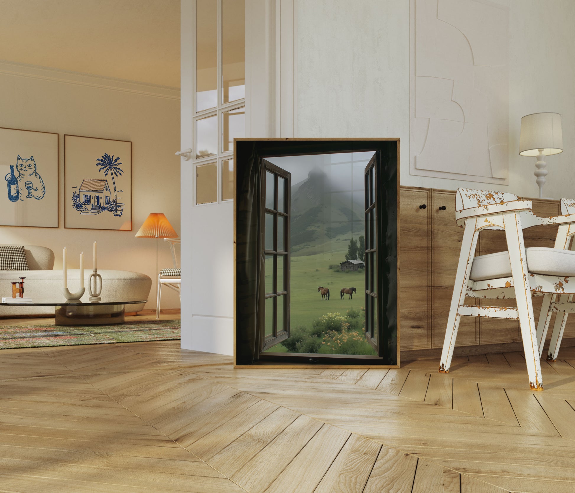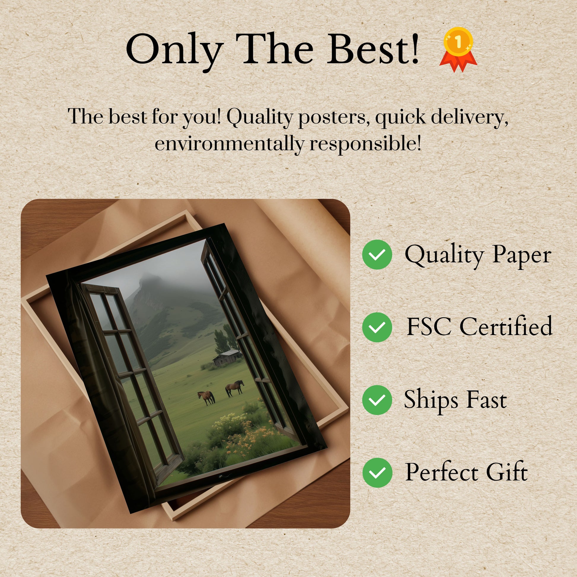 Step into a tranquil landscape where misty mountains embrace a verdant meadow, viewed through an open window. Two horses graze peacefully in the foreground, a rustic cabin nestled against the dramatic, fog-shrouded peak. This poster captures the raw beauty of untouched wilderness, inviting viewers to breathe in the calm of remote natural splendor.