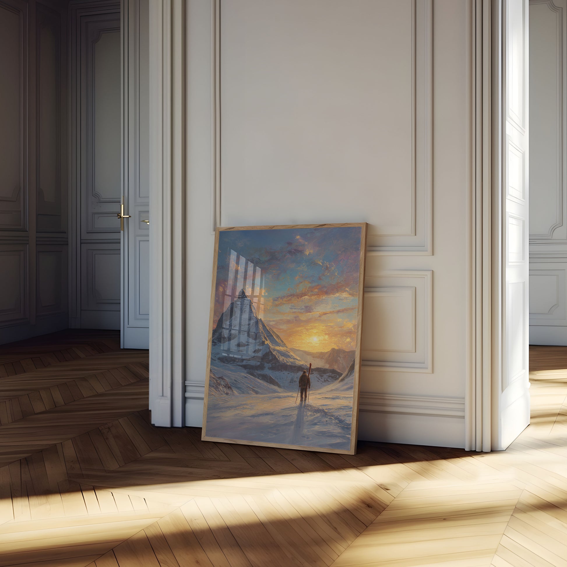 A breathtaking winter landscape captures a lone skier standing before the majestic Matterhorn at sunrise. Soft golden light bathes the snow-covered mountain, creating a dramatic silhouette against a vibrant, painterly sky. The scene evokes a sense of solitude, adventure, and the raw beauty of alpine wilderness.