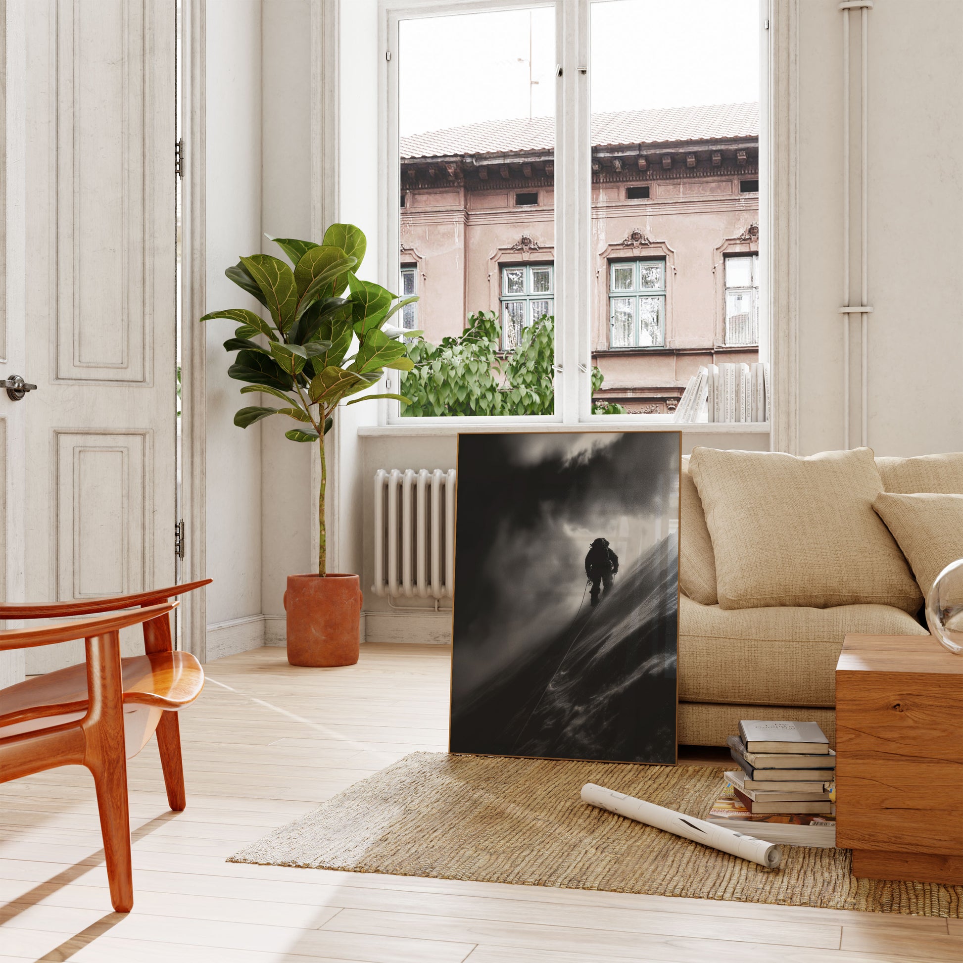 A solitary climber braves treacherous slopes against a dramatic, moody backdrop of swirling clouds and steep terrain. The black and white image captures the raw intensity of mountain exploration, revealing the human silhouette as a tiny yet determined figure against the overwhelming natural landscape.