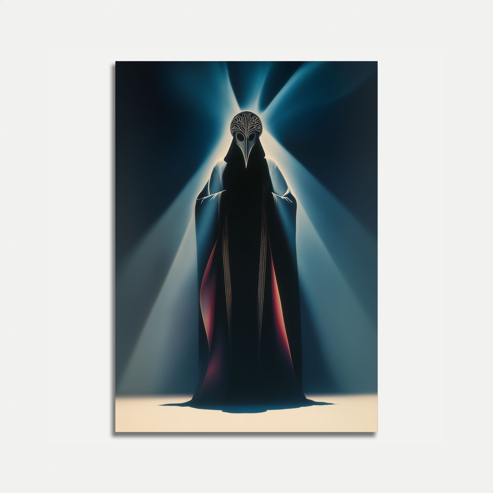 A hauntingly ethereal illustration depicts a stylized plague doctor figure bathed in celestial blue light. The mysterious silhouette features an intricate beaked mask and flowing dark robes with subtle red accents, creating an atmosphere of enigmatic elegance and otherworldly intrigue.