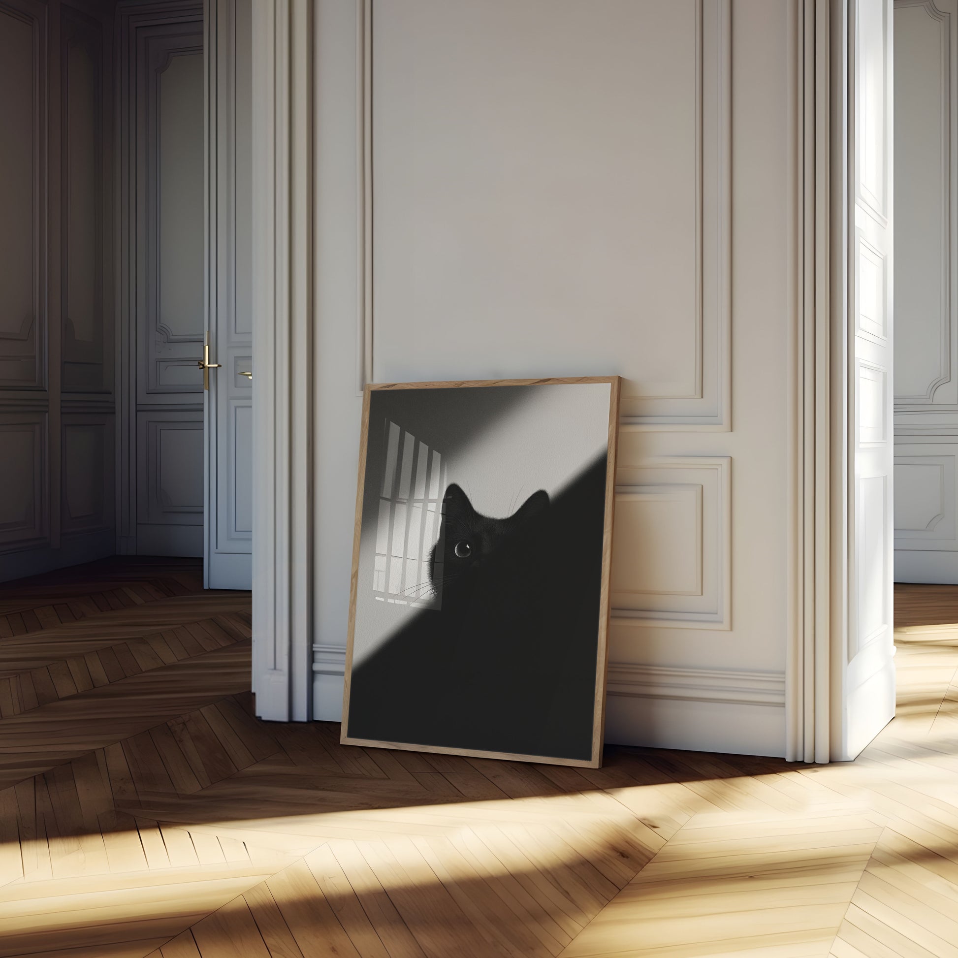 A stunning black and white portrait of a sleek black cat, captured in an ethereal moment of silent contemplation. The dramatic lighting creates a mesmerizing contrast, highlighting the cat's luminous eye and delicate whiskers against a gradient background of soft grays and deep blacks.