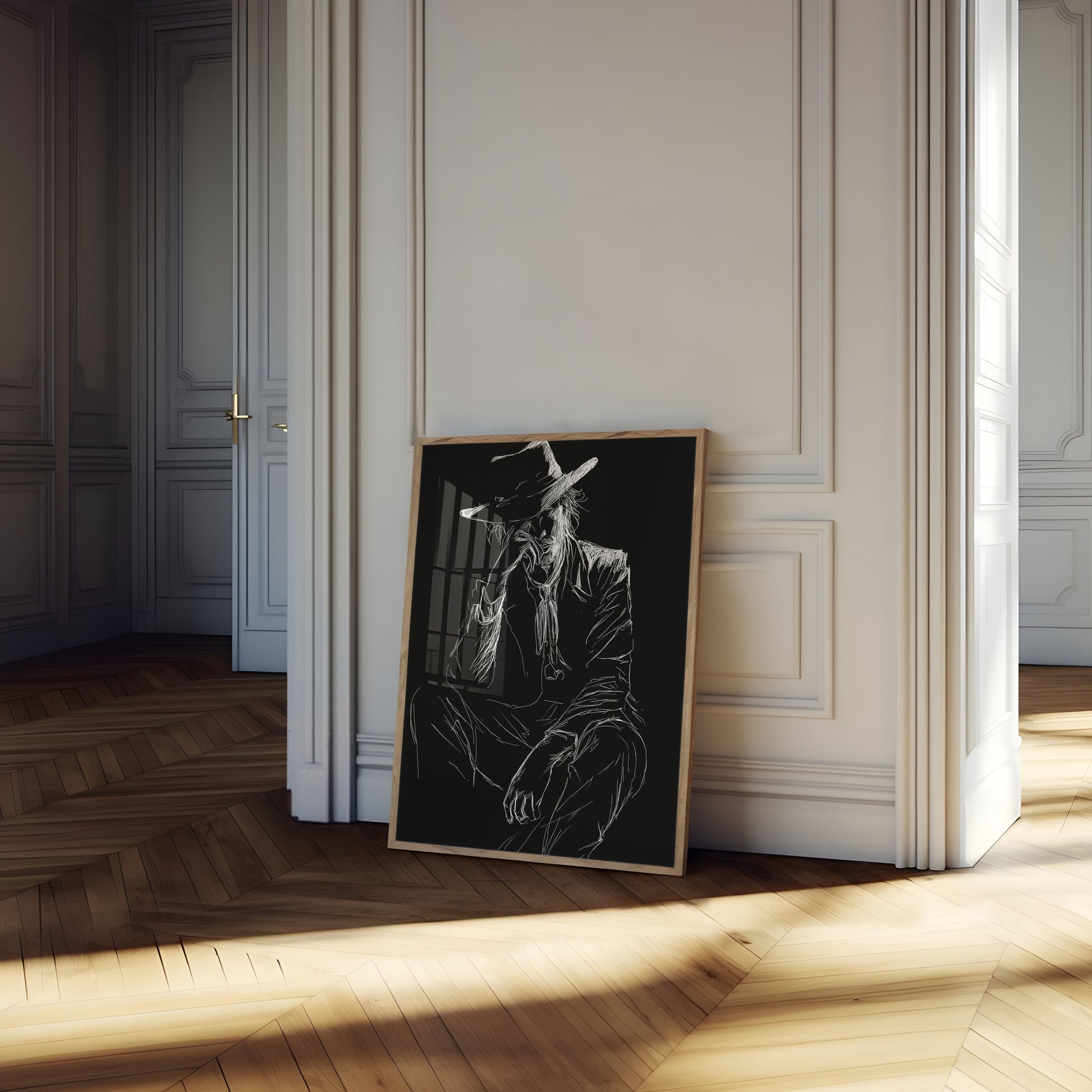 A striking black and white sketch captures the essence of a lone cowboy, rendered in dramatic, scratchy linework against a deep black background. The figure wears a wide-brimmed hat and sits with a sense of brooding introspection, his angular form suggesting both strength and vulnerability. This artistic poster transforms a classic western archetype into a powerful graphic statement.